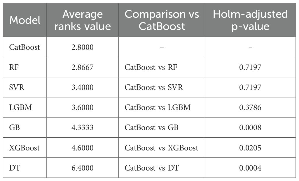 The Friedman test based on rRMSE from 15 outer cross-validation folds for each ML algorithm indicated that at least one of the ML algorithms performed significantly better than the others in predicting the fourth internode length ( = 30.457, p-value< 0.05). Following Friedman test, we ranked the models by computing The CatBoost (average rank = 2.8) was ranked first, followed by RF (average rank = 2.8667), SVR (average rank = 3.40), LGBM (average rank = 3.60), GB (average rank = 4.3333), XGBoost (average rank = 4.60), and DT (average rank = 6.40) as shown in Table 4. In addition, when we performed post-hoc tests using Wilcoxon signed-rank tests with the Holm adjustment to compare other models to the first-ranked model, the results indicated that the CatBoost significantly outperformed the GB (p-value = 0.0008), the DT (p-value = 0.0004), and the XGBoost models (p-value = 0.0205). No significant difference was observed in the estimates between CatBoost and RF (p-value = 0.7197), SVR (p-value = 0.7197), and LGBM (p-value = 0.3786). However, since the CatBoost model’s mean rRMSE and R² exceed those of the other models, it was selected as the best model for predicting the fourth internode length.