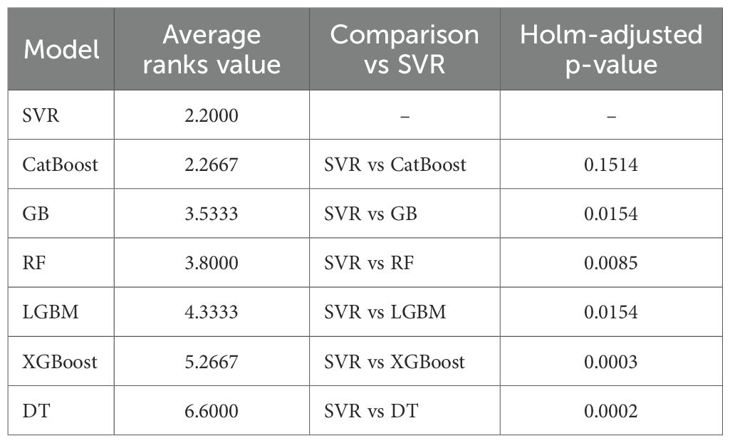 Similarly, the Friedman test based on rRMSE for predicting the height-to-node ratio has also indicated that at least one of the ML algorithms performed significantly better than the others ( = 48.143, p-value< 0.05). The SVR (average rank = 2.2) was ranked first, followed by the CatBoost (average rank = 2.2667), the GB (average rank = 3.5333), the RF (average rank = 3.8000), the LGBM (average rank = 4.3333), the XGBoost (average rank = 5.2667), and the DT (average rank = 6.6000) as shown in Table 5. The post-hoc tests using Wilcoxon signed-rank tests with the Holm adjustment to compare other models to the first-ranked model indicated that the SVR significantly outperformed the XGBoost (p-value = 0.0003), DT (p-value = 0.0002), LGBM (p-value = 0.0154), RF (p-value = 0.0085), and GB (p-value = 0.0154). No significant difference was observed in the estimates between SVR and CatBoost (p-value = 0.1514). However, since the SVR model’s mean rRMSE and R² exceed that of the CatBoost, the SVR model was selected as the best model for predicting height-to-node ratio.
