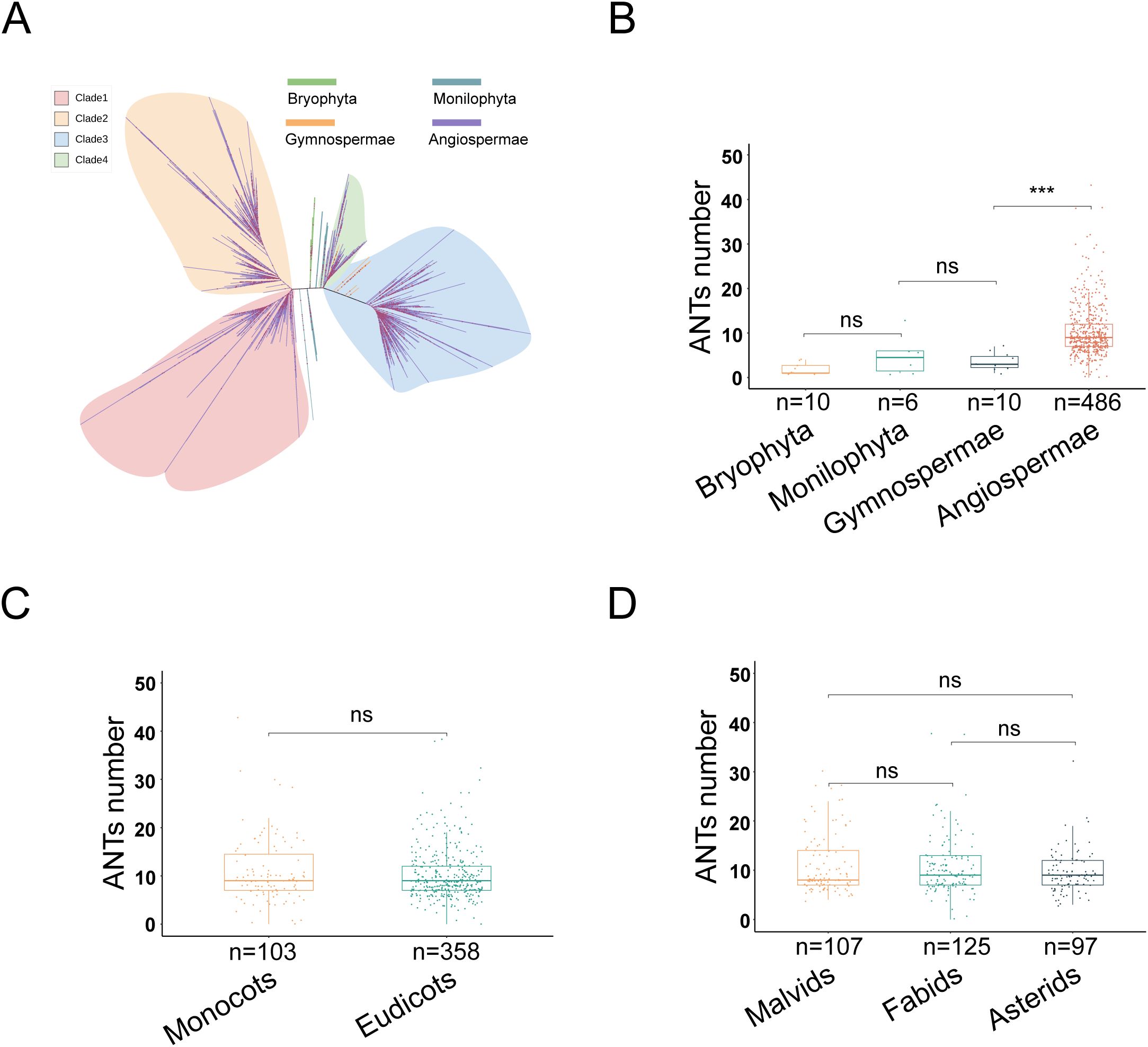 Figure 1. The evolution of ANT family in green plants. (A) Phylogenetic tree of 6,305 ANT proteins (ANTs). Colors represent different phyla. Bryophyta, Monilophyta, Gymnospermae, Angiospermae. (B) The number of ANTs in different phyla (Bryophyta, Monilophyta, Gymnospermae, Angiospermae) of terrestrial plants. (C) The number of ANTs in different class (Monocots and Eudicots) of Angiospermae. (D) The number of ANTs in Malvids, Fabids and Asterids of Eudicots.