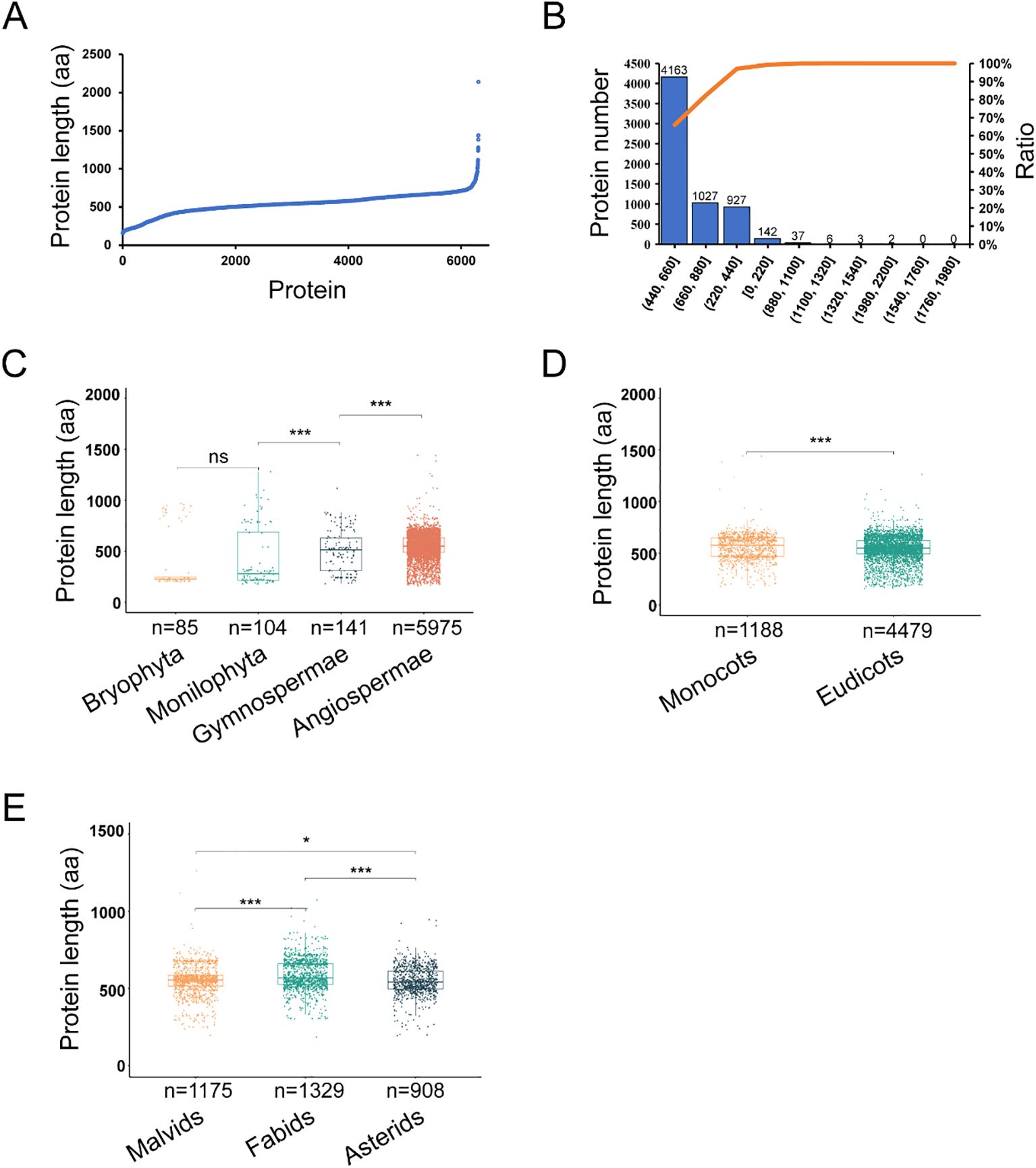 Figure 3. The evolution of 6,305 ANTs length in green plants. (A) The distribution of ANTs length. (B) The frequency distribution of ANT protein lengths. (C) The ANTs length in different phyla (Bryophyta, Monilophyta, Gymnospermae, Angiospermae). (D) The ANTs length in Angiospermae (Monocots and Eudicots). (E) The ANTs length in Eudicots (Malvids, Fabids and Asterids). *P< 0.05, **P < 0.01, ***P < 0.001, ns P > 0.05 by Mann-Whitney U test.