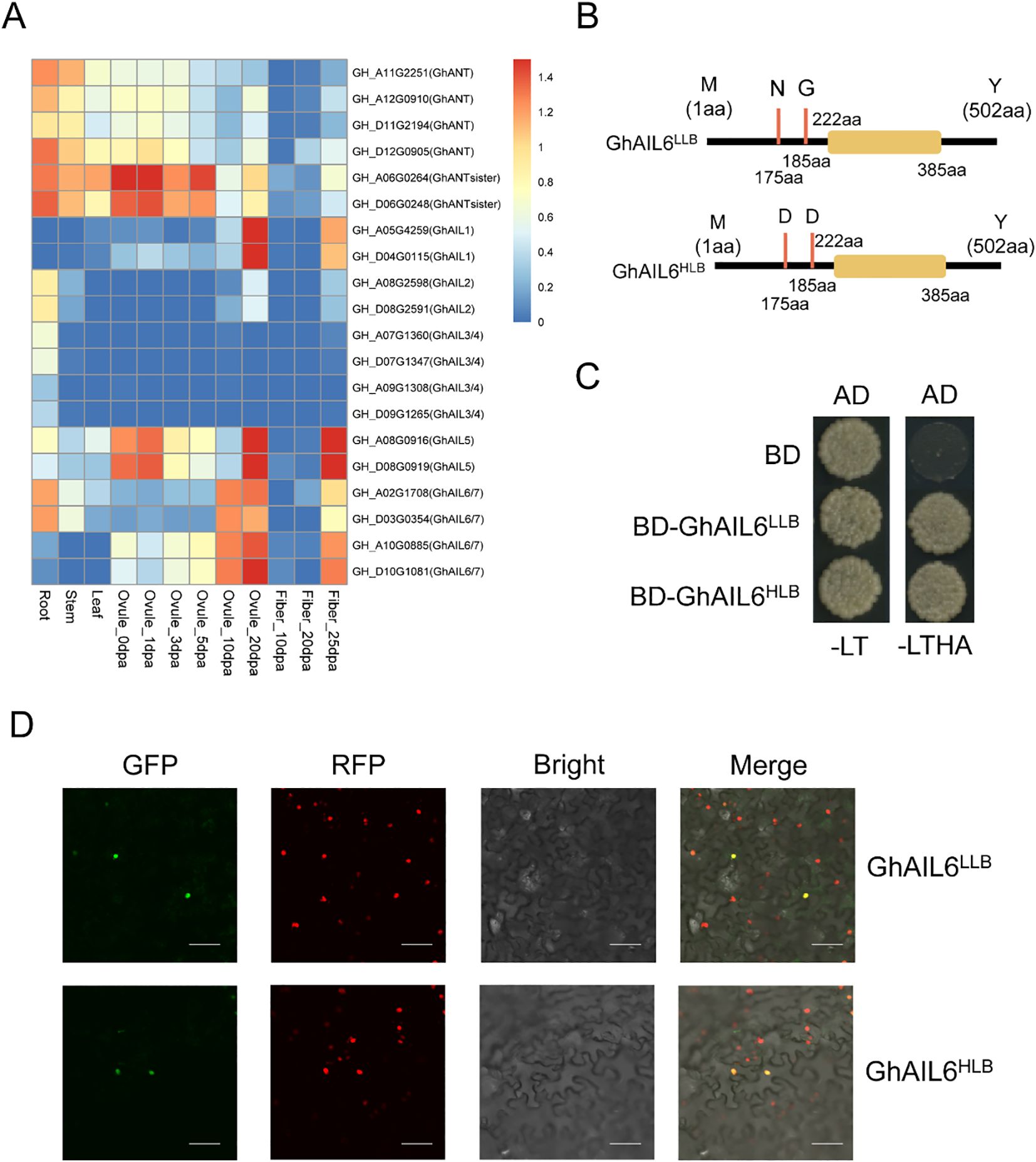 Figure 4. The ANT/AILs in upland cotton. (A) Expression pattern of ANT protein in different tissues of upland cotton. Root stands for root, Stem stands for stem, Leaf stands for leaf, Ovule stands for ovule, Fiber stands for fiber, and dpa stands for Days Post Anthesis, which represents the number of days after flowering. (B) Amino acid differences between the two proteins GhAIL6LLB and GhAIL6HLB. (C) Verification of the self-activation ability of the two proteins GhAIL6LLB and GhAIL6HLB. AD: pGADT7 vector, BD: pGBKT7 vector, -LT: SD/-Leu-Trp, -LTHA: SD/-Leu-Trp-His-Ade. (D) Subcellular localization of the two proteins GhAIL6LLB and GhAIL6HLB. GFP: green fluorescent protein, RFP: red fluorescent protein, Bright: bright field, Merge: merged bright and dark field. The constructed GhAIL6HLB-GFP fusion protein and GhAIL6LLB-GFP fusion protein were transiently expressed in tobacco stably transformed with 35S:H2B-RFP. The scale bar in the figure represents 50 μm.