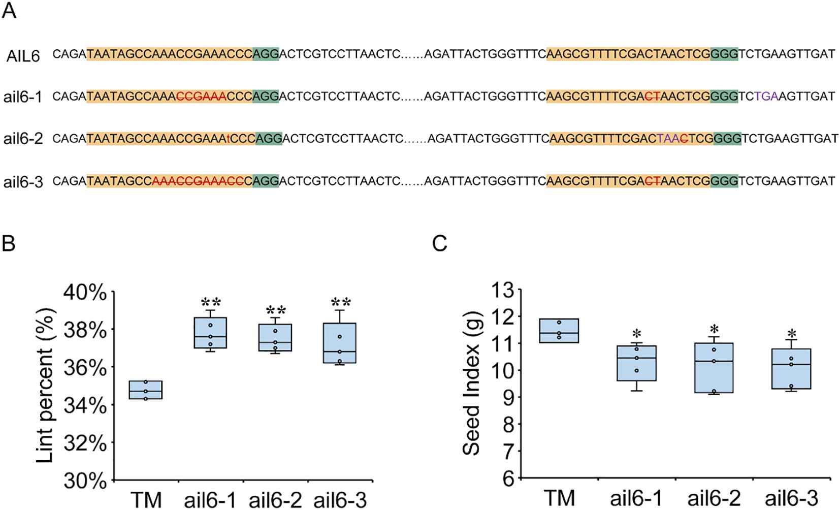 Figure 5. GhAIL6 regulates lint percentage and seed index of upland cotton. (A) Editing target and editing type of GhAIL6. Yellow represents the target sequence, green represents PAM, red represents the type of gene editing, purple represents the stop codon formed after gene editing, the number represents the position of the base on the CDS sequence, AIL6 represents the amino acid sequence in the TM-1 material, and ail6-1, ail6–2 and ail6–3 represent the three gene editing materials, respectively. (B) Comparison of TM-1, ail6-1, ail6–2 and ail6–3 lint percentage. (C) Comparison of TM-1, ail6-1, ail6-2, and ail6–3 seed index. *P < 0.05 and **P < 0.01 by two-tailed Student’s t-test (n = 5).