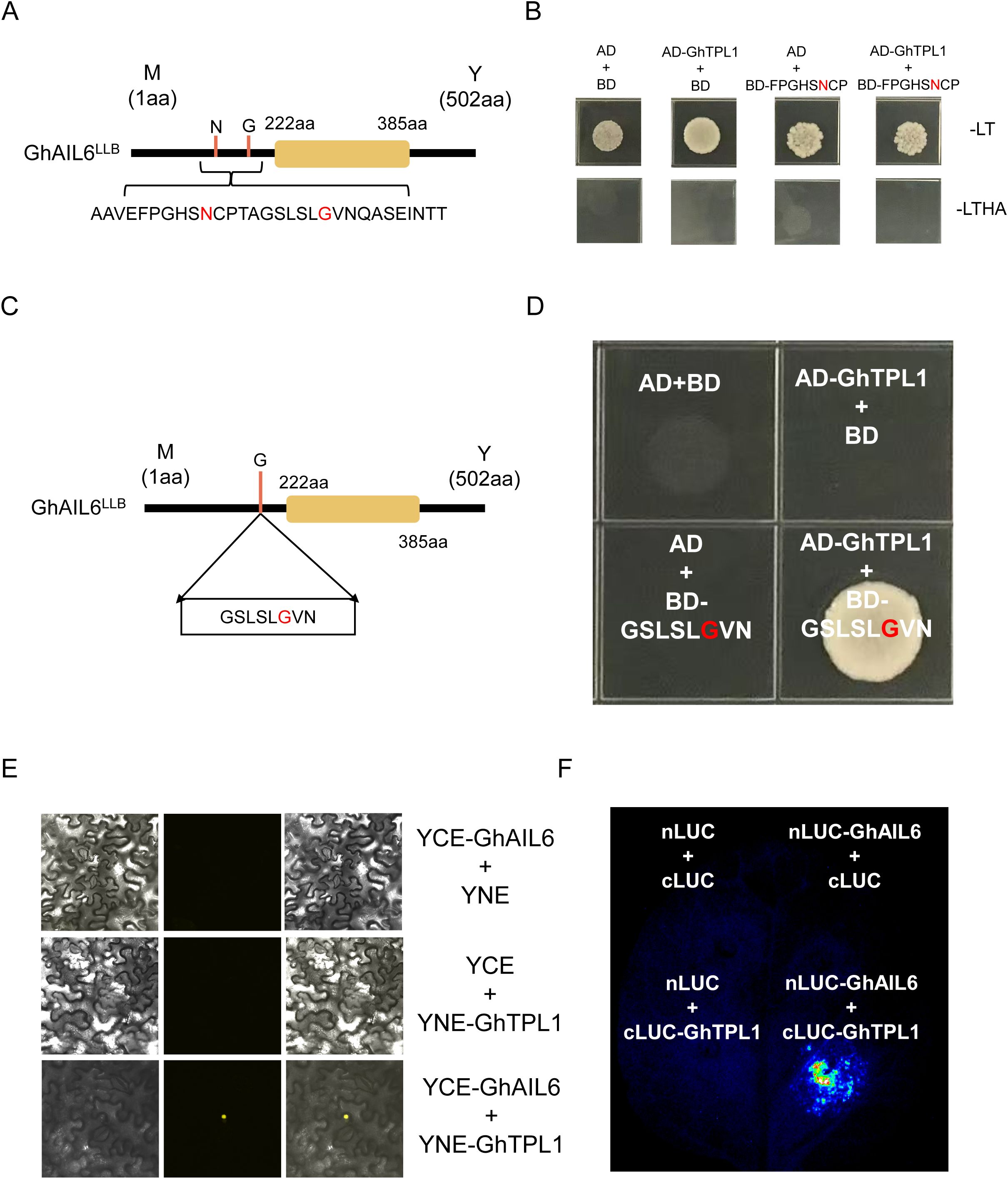Figure 6. GhAIL6 interacts with GhTPL1. (A) 30 amino acid motifs containing two sites of variation. (B) Yeast two-hybrid experiment with GhTPL1 protein of the first motif. AD: pGADT 7 vector, BD: pGBKT 7 vector, -LT: SD/-Leu-Trp, -LTHA: SD/-Leu-Trp-His-Ade. (C) The second motif location and variant type of GhAIL6 protein. (D) Yeast two-hybrid experiments with GhTPL1 of the second motif performed on SD/-Leu-Trp-His-Ade medium. AD: pGADT 7 vector, BD: pGBKT 7 vector. (E) Double-luciferase complementation assay of GhAIL6 and GhTPL1. (F) Bimolecular fluorescence complementation experiment of GhAIL6 and GhTPL1.