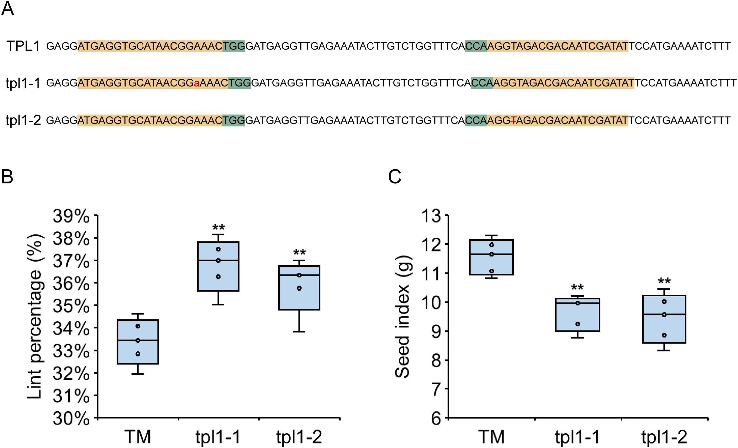 Figure 7. GhTPL1 regulates lint percentage and seed index of upland cotton. (A) Editing target and editing type of GhTPL1. Yellow represents the target sequence, green represents PAM, red represents the type of gene editing, purple represents the stop codon formed after gene editing, the number represents the position of the base on the CDS sequence, TPL1 represents the amino acid sequence in the TM-1 material, and tpl1–1 and tpl1–2 represent the three gene editing materials, respectively. (B) Comparison of TM-1, tpl1–1 and tpl1–2 lint percentage. (C) Comparison of TM-1, tpl1–1 and tpl1–2 seed index. *P < 0.05 and **P < 0.01 by two-tailed Student’s t-test (n = 5).