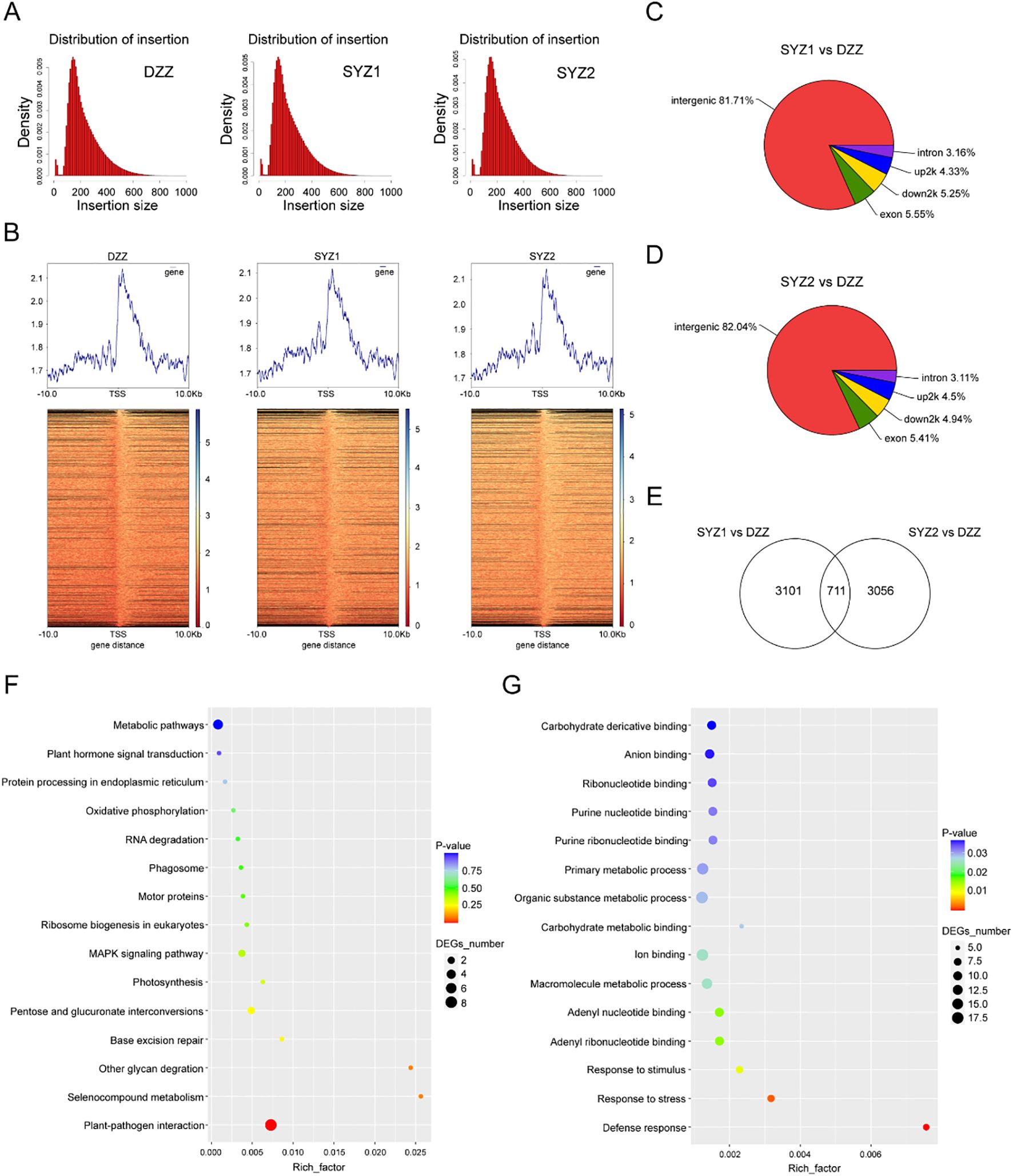 Figure 8. DAP-seq technology for finding the downstream genes and networks of GhAIL6. (A) Distribution of insert length in the control group (DZZ), experimental group 1 (SYZ1), and experimental group 2 (SYZ2). (B) Upstream and downstream abundance of different treatments in the body region of the gene. (C) Distribution of functional elements of Peak in SYZ1 vs DZZ. (D) Distribution of functional elements of Peak in SYZ2 vs DZZ. (E) Statistics of the intersection of the peaks of the two experimental groups. (F) GO enrichment analysis of 711 Peaks. (G) KEGG analysis of 711 Peaks.