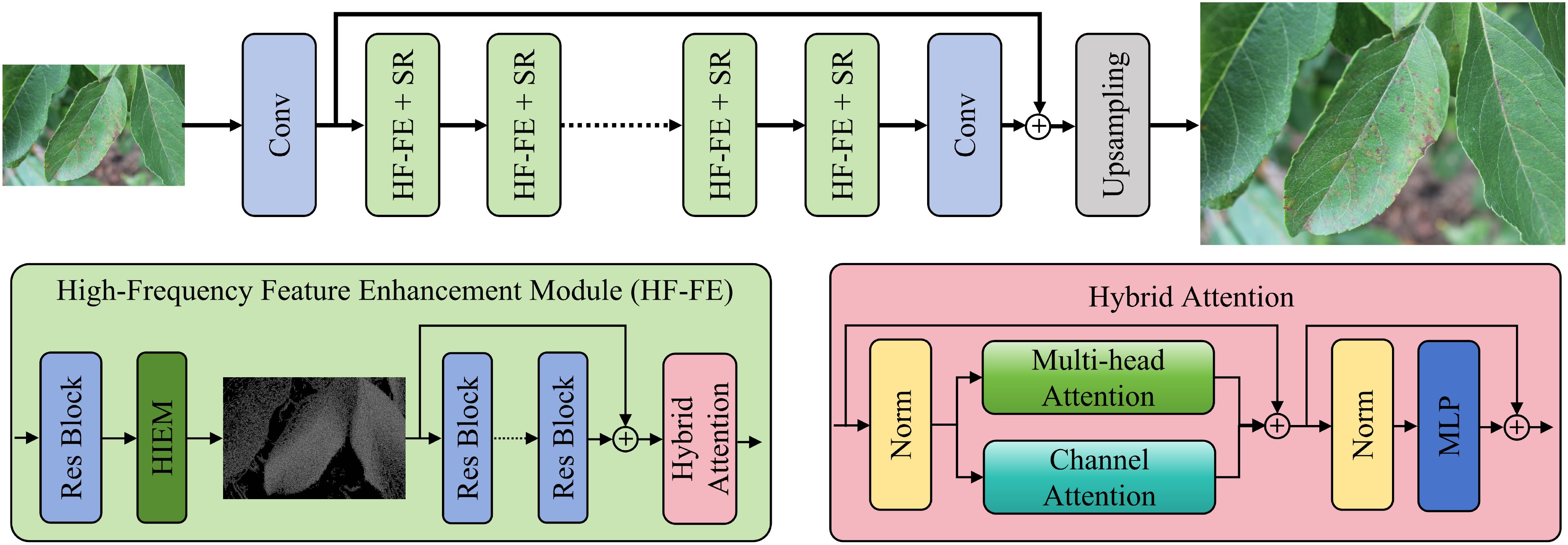 Most general-purpose SR Cap et al. (2021); Ovečka et al. (2022) architectures are optimized for natural image benchmarks, and they often oversmooth or suppress exactly the high-frequency structures that plant scientists and agronomists care most about. In practice, agronomic decision-making frequently depends on subtle visual cues: vein topology and vein density for phenotyping Huang et al. (2023) and stress assessment Istiak et al. (2024); thin lesion rims, speckle-like infection patterns, and chlorotic edges for early disease diagnosis Zhu et al. (2021); Sathya and Rajalakshmi (2022); Yeswanth et al. (2022); serrated and slender leaf boundaries for species- or health-related morphology in aquatic vegetation; and palm frond geometry and crown contours for stand counting and canopy assessment in plantation monitoring. These biologically meaningful structures are thin, branching, high-frequency patterns that generic SR models tend to degrade. To address this gap, we introduce a plug-and-play High-Frequency Feature Enhancement (HF-FE) module that explicitly targets biologically relevant high-frequency content in plant images. The proposed module combines a Laplacian-based High-Frequency Enhancement Mechanism (HIEM) with a Hybrid Attention (HA) mechanism to (i) extract and amplify fine edge and texture information (e.g., venation, lesion boundaries, palm canopy edges), and (ii) suppress irrelevant background noise. Unlike simply deepening an SR backbone, the HF-FE branch can be inserted into different SR architectures—including CNN-based, attention-based, and Transformer-based models—with minimal modification. As we will show, this design yields consistent gains across diverse plant imaging scenarios, including UAV plantation imagery, aquatic vegetation surveys, and close-range disease monitoring.
