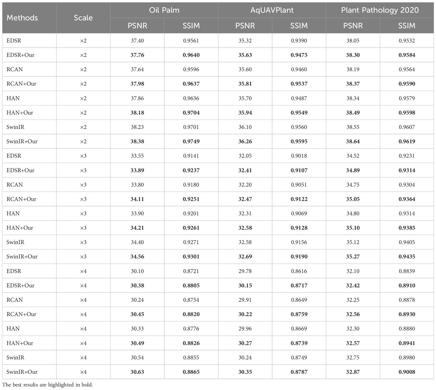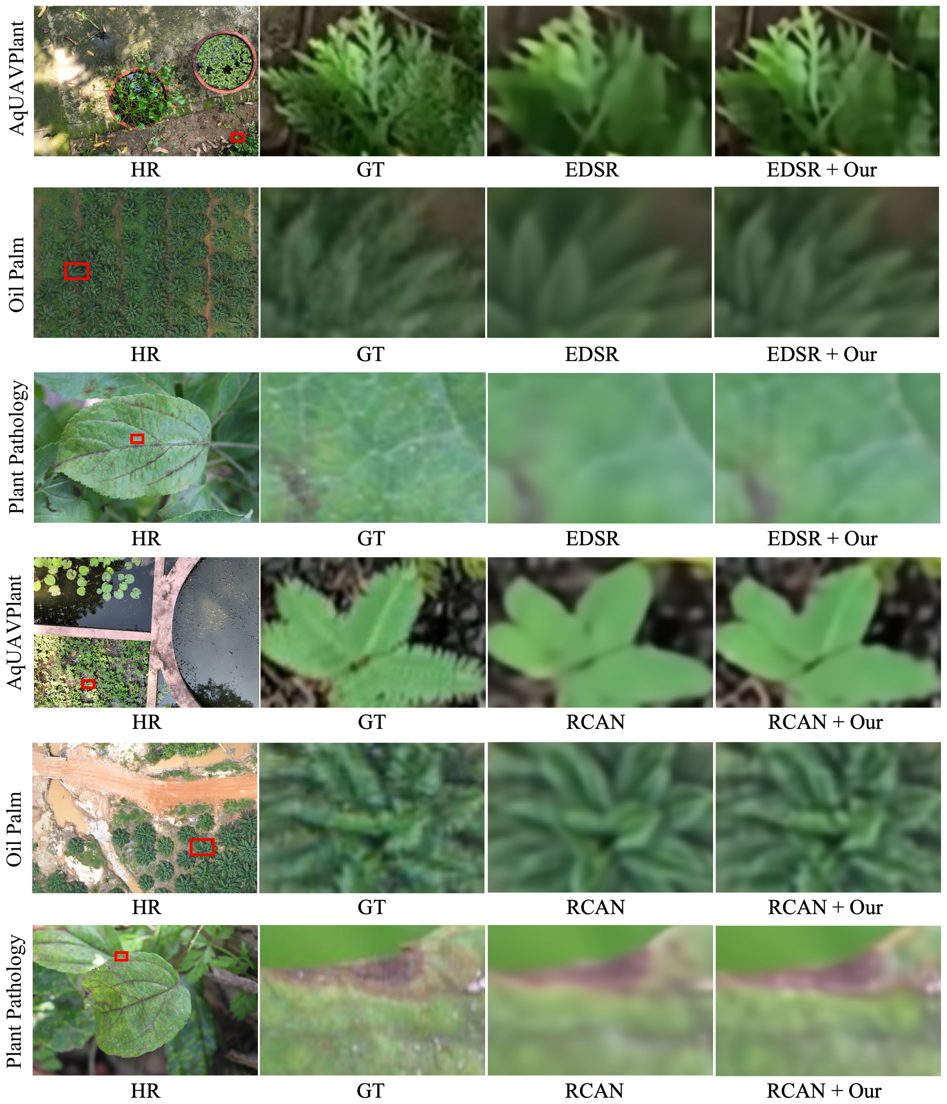 Under the $times3 upscaling setting, similar performance trends are observed. EDSR+Our attains 33.89 dB/0.9237 on Oil Palm, improving by 0.34 dB and 0.0086 in SSIM compared to the baseline. RCAN+Our further raises PSNR to 34.11 dB and SSIM to 0.9251, while HAN+Our achieves 34.21 dB/0.9261, both surpassing their counterparts by 0.3–0.4 dB. On the challenging AqUAVPlant dataset, the proposed module enhances texture recovery and structural consistency, as seen in RCAN+Our (32.47 dB/0.9122) and HAN+Our (32.58 dB/0.9128). SwinIR+Our again obtains the best overall results (34.56 dB/0.9301 on Oil Palm and 35.27 dB/0.9435 on Plant Pathology 2020), confirming the robustness and scalability of our design.