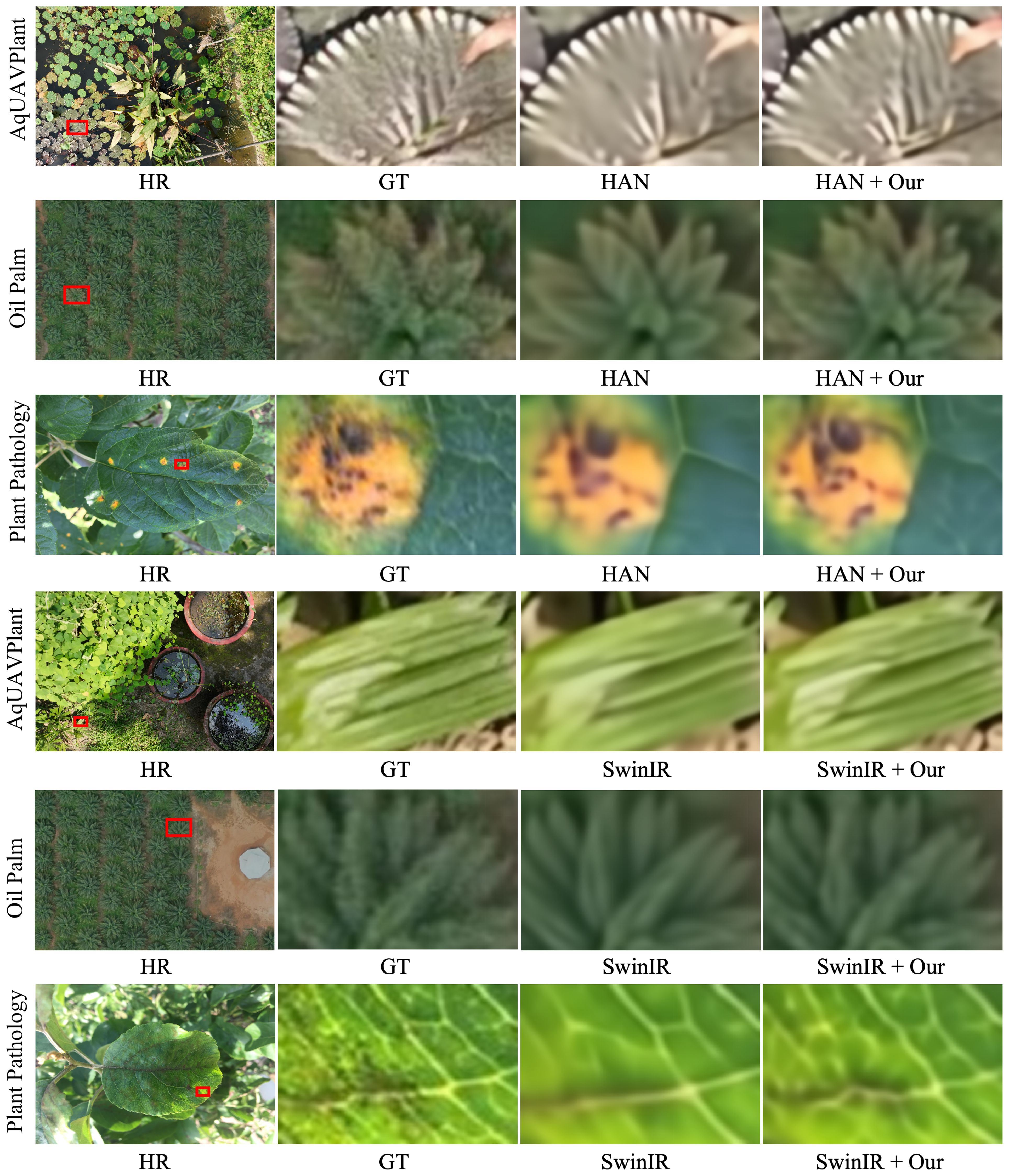 Figure 3. Visual comparison of reconstruction results between HAN/SwinIR and their enhanced versions (HAN+Our, SwinIR+Our) on the AqUAVPlant, Oil Palm, and Plant Pathology 2020 datasets under ×4 upscaling. The enhanced models better preserve high-frequency plant structures, reduce oversmoothing, and maintain more coherent texture continuity across leaf surfaces. In particular, lesion boundaries and vein patterns become more distinct, and palm canopy edges remain more stable, which supports downstream tasks such as health monitoring and stress assessment.