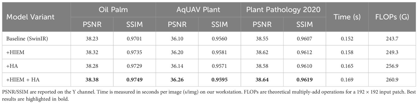 To further validate the effectiveness of each component in the proposed model, we conducted ablation experiments focusing on the HIEM and the HA mechanism. Table 2 summarizes the quantitative results on the Oil Palm, AqUAVPlant, and Plant Pathology 2020 datasets under the ×2 upscaling factor. The baseline model is SwinIR, and all variants were trained under identical settings for fair comparison.