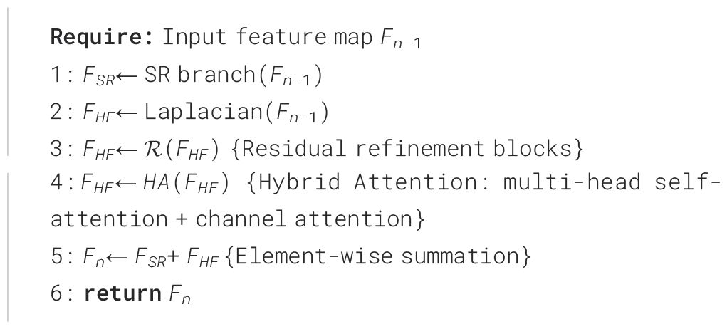 Algorithm 1 summarizes the forward path of one HF-FE + SR module. The SR branch focuses on global structural fidelity, while the HF-FE branch applies the Laplacian-based HIEM, followed by residual refinement and a HA mechanism that fuses multi-head self-attention with channel attention. The two branches are fused by element-wise summation, Fn= FSR+ FHF. Stacking N such modules produces progressively refined feature maps. After the final module, a convolutional aggregation layer produces FD, which is fused with the shallow feature map F0, and then upsampled via pixel shuffle to obtain the final super-resolved image ISR. We use consistent notation for these feature maps throughout (FSR, FHF, Fn, FD, ISR) to improve reproducibility.