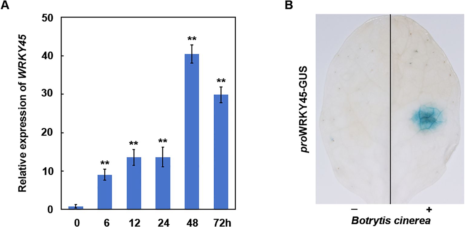 Figure 1. WRKY45 expression is induced by B. cinerea. (A) Time-course analysis of WRKY45 transcript accumulation in Arabidopsis following inoculation with (B) cinerea. Relative expression levels were quantified by qRT–PCR at 0, 6, 12, 24, 48, and 72 hours post-inoculation (hpi), using ACTIN2 as the internal reference gene. Data are presented as the mean ± SD (n = 3 independent biological replicates). Statistical significance was determined using one-way ANOVA, and asterisks indicate significant differences compared to 0 h (**P < 0.01). (B) Histochemical GUS staining of WRKY45p:GUS transgenic plants after B. cinerea inoculation. Strong GUS activity was observed at the inoculation sites (+), compared to untreated control sites (–), confirming local induction of WRKY45 expression by pathogen infection.