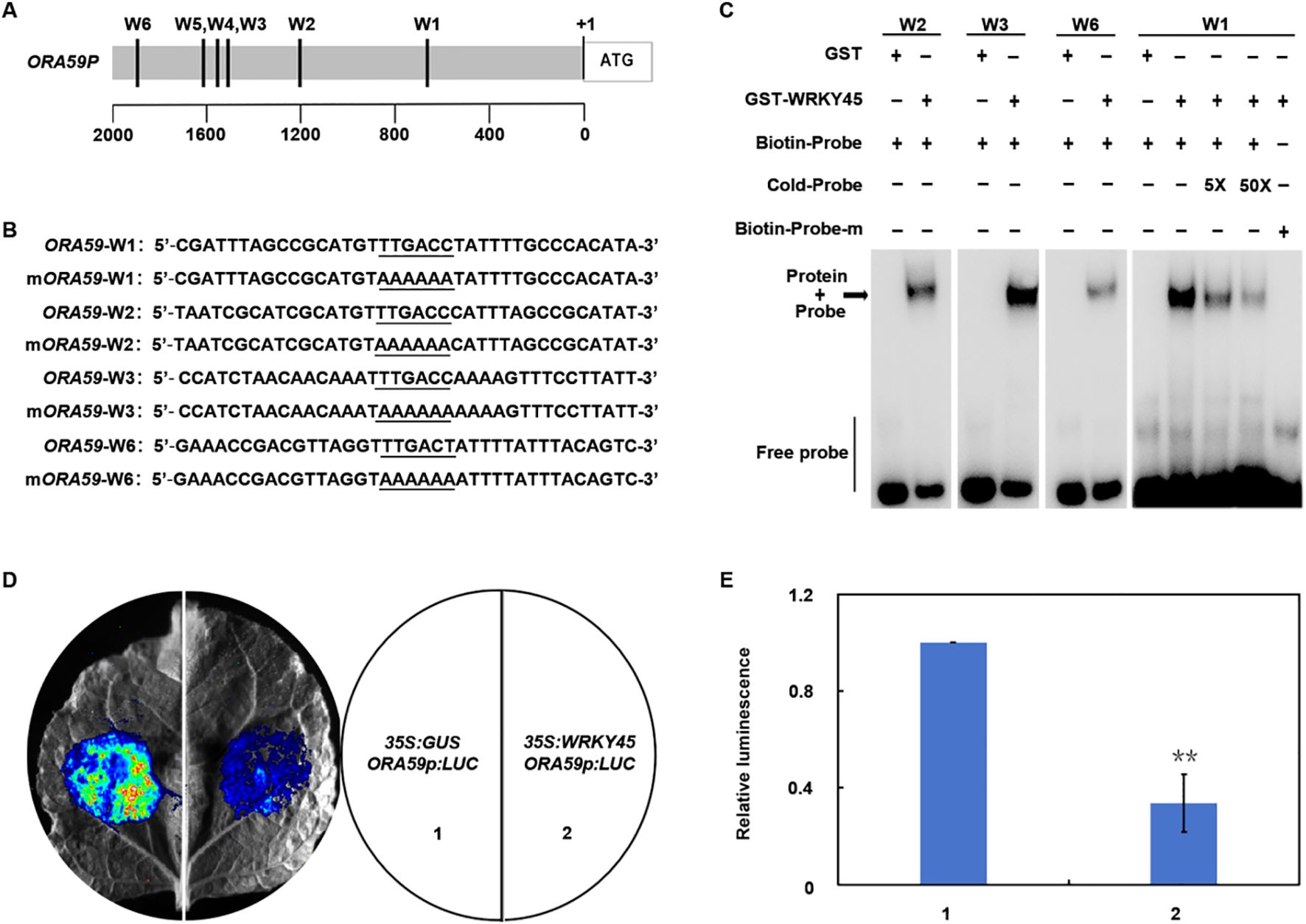 3.5 WRKY45 directly binds to the ORA59 promoter and represses its transcriptional activity