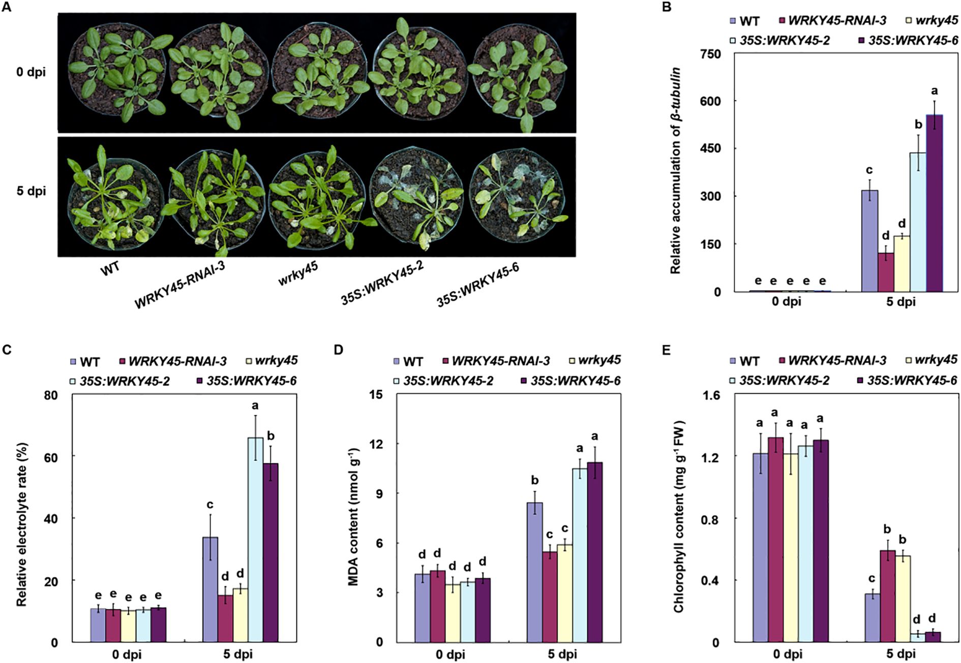 Figure 3. WRKY45 negatively regulates Arabidopsis resistance to B. cinerea. (A) Disease phenotypes of wild-type plants, wrky45 mutants, WRKY45−RNAi lines, and WRKY45 overexpression plants at 0 and 5 days post-inoculation (dpi) with B. cinerea. (B) Fungal biomass in infected leaves quantified by β−tubulin transcripts using qRT−PCR, with ACTIN2 as the internal reference gene for normalization. (C–E) Electrolyte leakage, malondialdehyde content, and chlorophyll content at 0 and 5 dpi. Data are presented as the mean ± SD (n = 3 independent biological replicates). Statistical significance was determined using two-way ANOVA followed by Tukey’s test. Different letters above the bars indicate significant differences (P < 0.05).