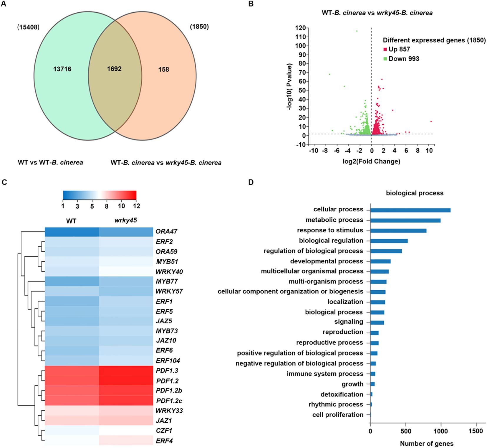 Figure 4. Transcriptomic analysis reveals WRKY45-dependent regulation of defense-associated genes in response to B. cinerea. (A) Venn diagram showing the overlap of genes co-regulated by B. cinerea and WRKY45 deficiency. The overlapping region represents genes co-regulated in the comparisons WT vs. WT–B. cinerea and WT–B. cinerea vs. wrky45–B. cinerea. (B) Volcano plot displaying differentially expressed genes (DEGs) between WT–B. cinerea vs. wrky45–B. cinerea. DEGs were defined using thresholds |log2 fold change| ≥ 1 and adjusted P value (Padj) < 0.05. The X-axis represents the fold change of the difference after conversion to log2, and the Y-axis represents the significance value after conversion to-log10. Red and green dots indicate up-regulated and down-regulated DEGs, respectively. (C) Hierarchical clustering of representative JA/ET-responsive, defense-related genes in the wrky45 mutant following (B) cinerea infection. (D) Gene Ontology (GO) enrichment analysis of 1,850 DEGs in the wrky45 mutant after (B) cinerea treatment, highlighting significant enrichment in biological processes related to plant immunity.