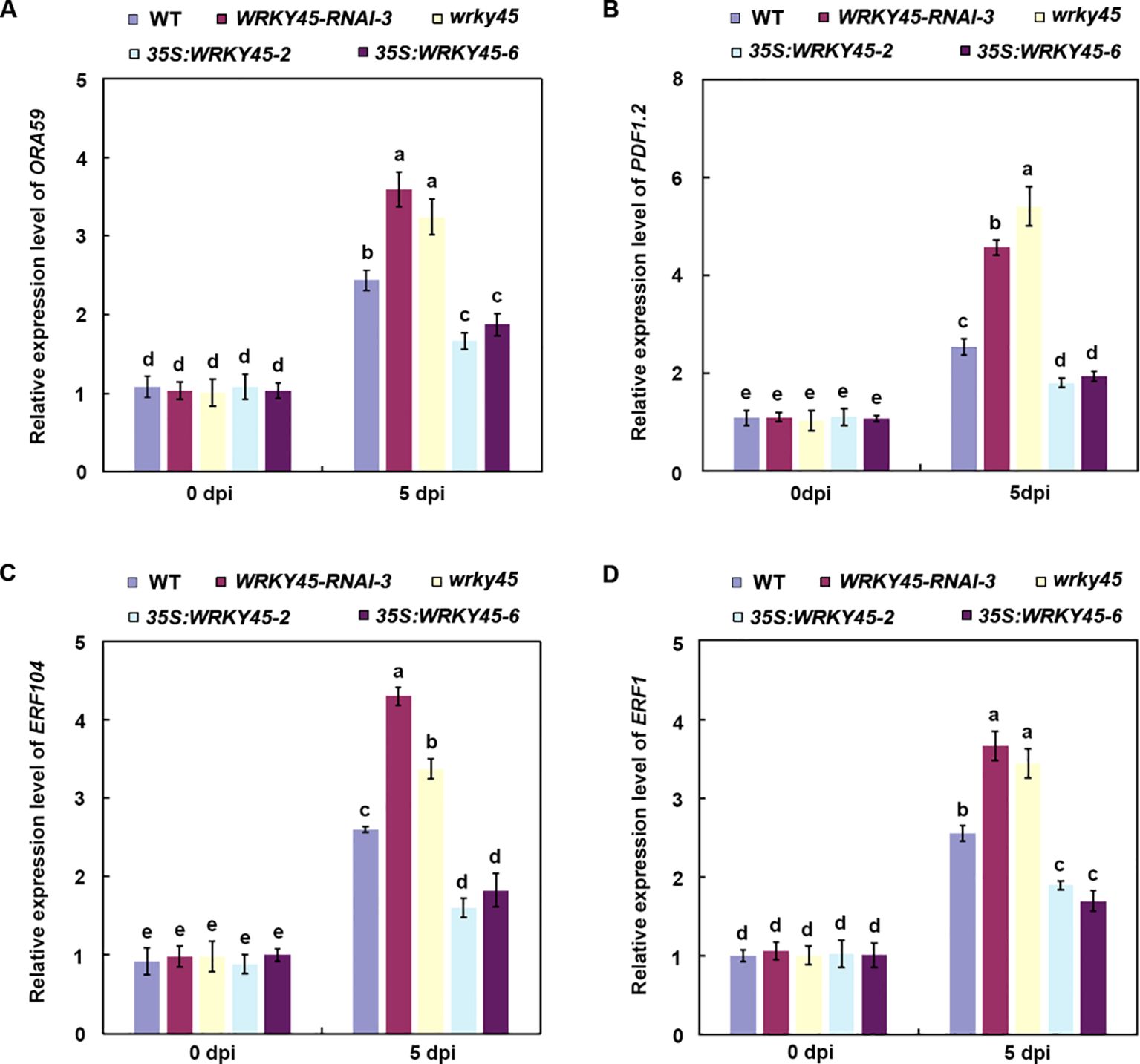 Figure 5. WRKY45 represses the expression of JA/ET-dependent defense genes. (A–D) Relative expression levels of ORA59 (A), PDF1.2 (B), ERF104 (C), and ERF1 (D) were quantified by qRT–PCR in wild-type, wrky45 knockout mutants, WRKY45-RNAi lines, and WRKY45 overexpression plants at 0 and 5 days post-inoculation (dpi) with B. cinerea. using ACTIN2 as the internal reference gene. Data are presented as the mean ± SD (n = 3 independent biological replicates). Statistical significance was determined using two-way ANOVA followed by Tukey’s test. Different letters above the bars indicate significant differences (P < 0.05).