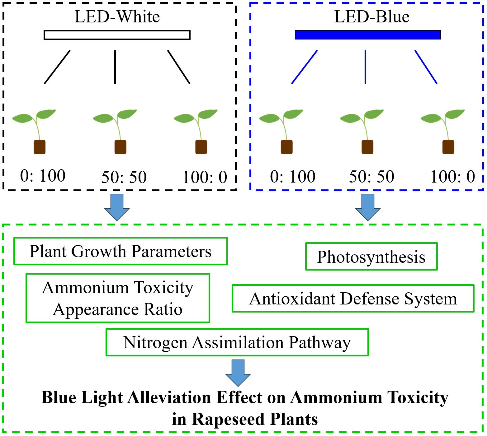 Therefore, the current study was undertaken to (1) characterize NH4+ toxicity in rapeseed by applying a high level of NH4+, (2) determine whether blue light can mitigate NH4+ toxicity in rapeseed, and (3) ascertain the alleviatory effects of blue light on rapeseed growth attributes, photosynthetic capacity, antioxidant defense system, and nitrogen metabolism machinery.