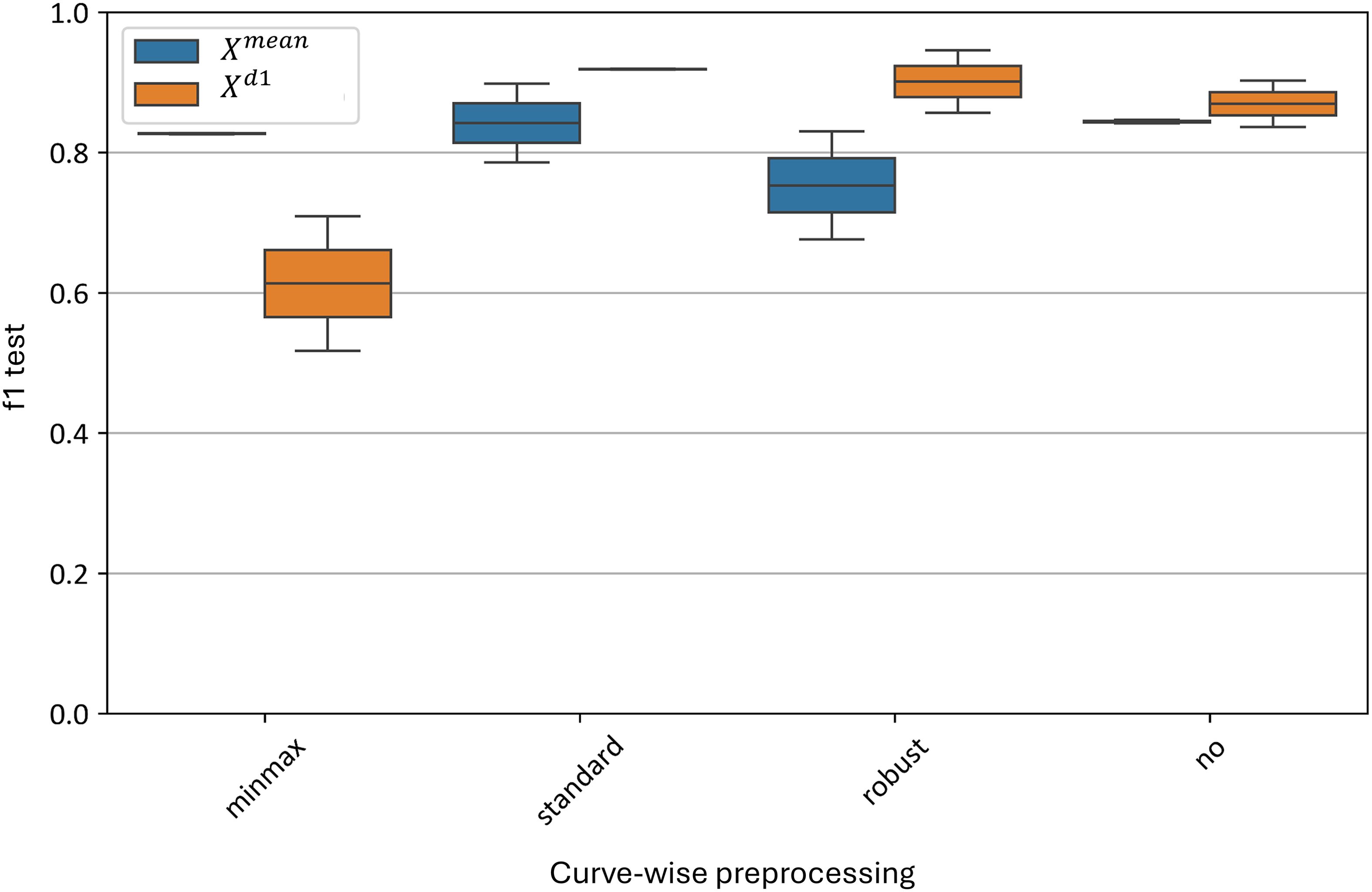 Among curve-wise normalizations, the standard algorithm achieved the best results, with an F1-score of 0.79–0.88 for the average model and 0.89–0.90 for the first-derivative model. Not applying any preprocessing also provided good results, with F1-scores of 0.83–0.84 for the average model and 0.83–0.89 for the first-derivative model. The worst results for the average model were achieved with robust normalization, yielding an F1-score of 0.67–0.84, while for the first-derivative model, minmax normalization performed with an F1-score of 0.55–0.67.
