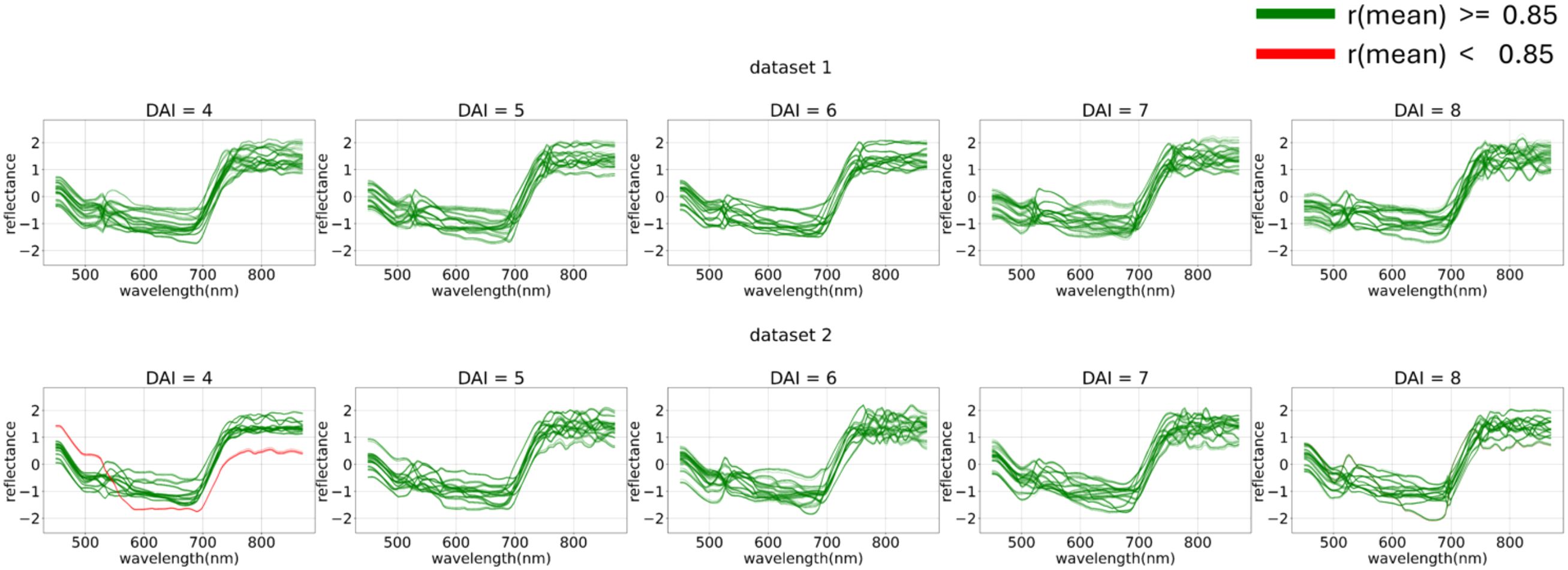 Figure 4. Average hyperspectral curves of the control and experimental groups from 4 (DAI = 4) to 8 (DAI = 8) days after inoculation across both imaging sessions (after applying curve-wise standard preprocessing) (top – first repetition of the experiment, bottom – second repetition of the experiment). Control - healthy wheat plants, Experiment - wheat plants inoculated with Pgt. The vertical scale shows the reflectivity expressed in normalized values, and the horizontal scale shows the spectrum wavelengths expressed in nanometers.