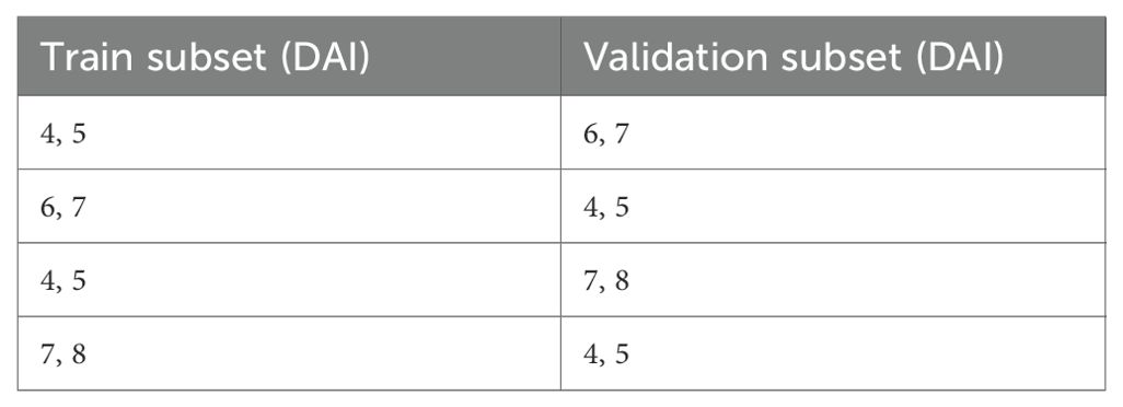 The cross-testing scenarios that were used in this study are shown in the Table 2 below. In this approach, training and validation were performed on the data from one experiment, while testing was conducted on the data from the other experiment each time.