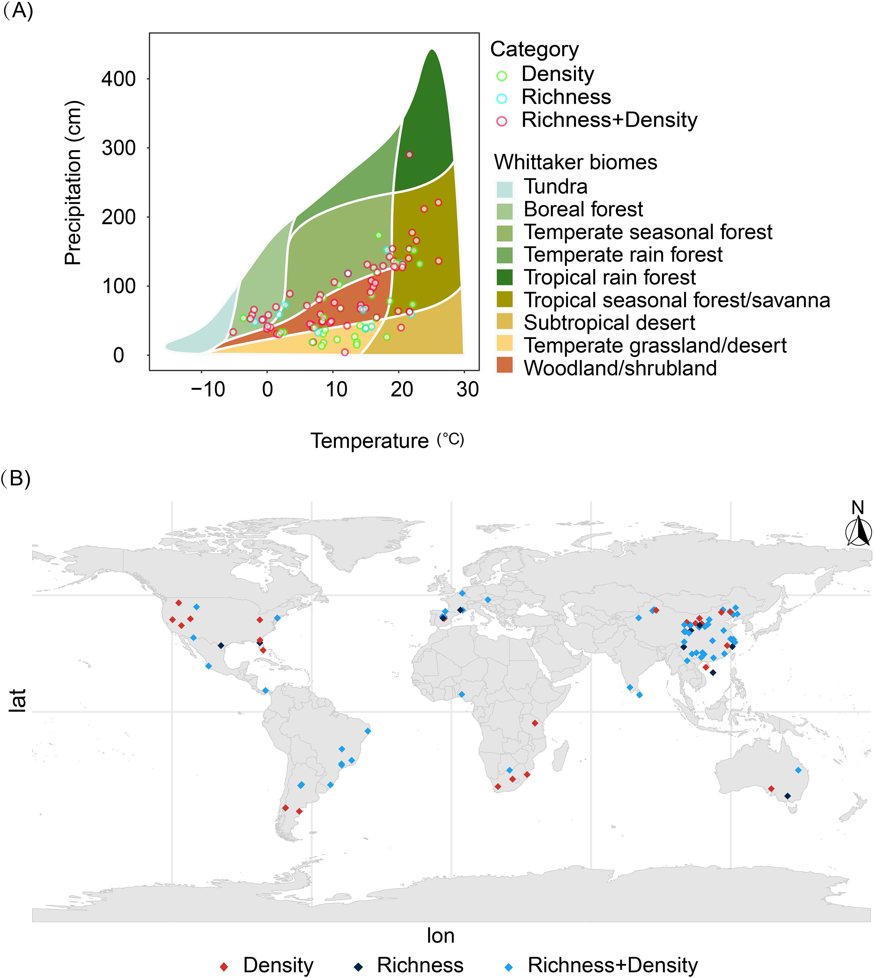 Figure 1. Geographic distribution of survey sites covered in this study (A) and biogeographic regions (B). Green hollow circles indicate sites providing only seed bank density data, blue hollow circles indicate sites providing only species richness data, and red hollow circles indicate sites providing both density and richness data.