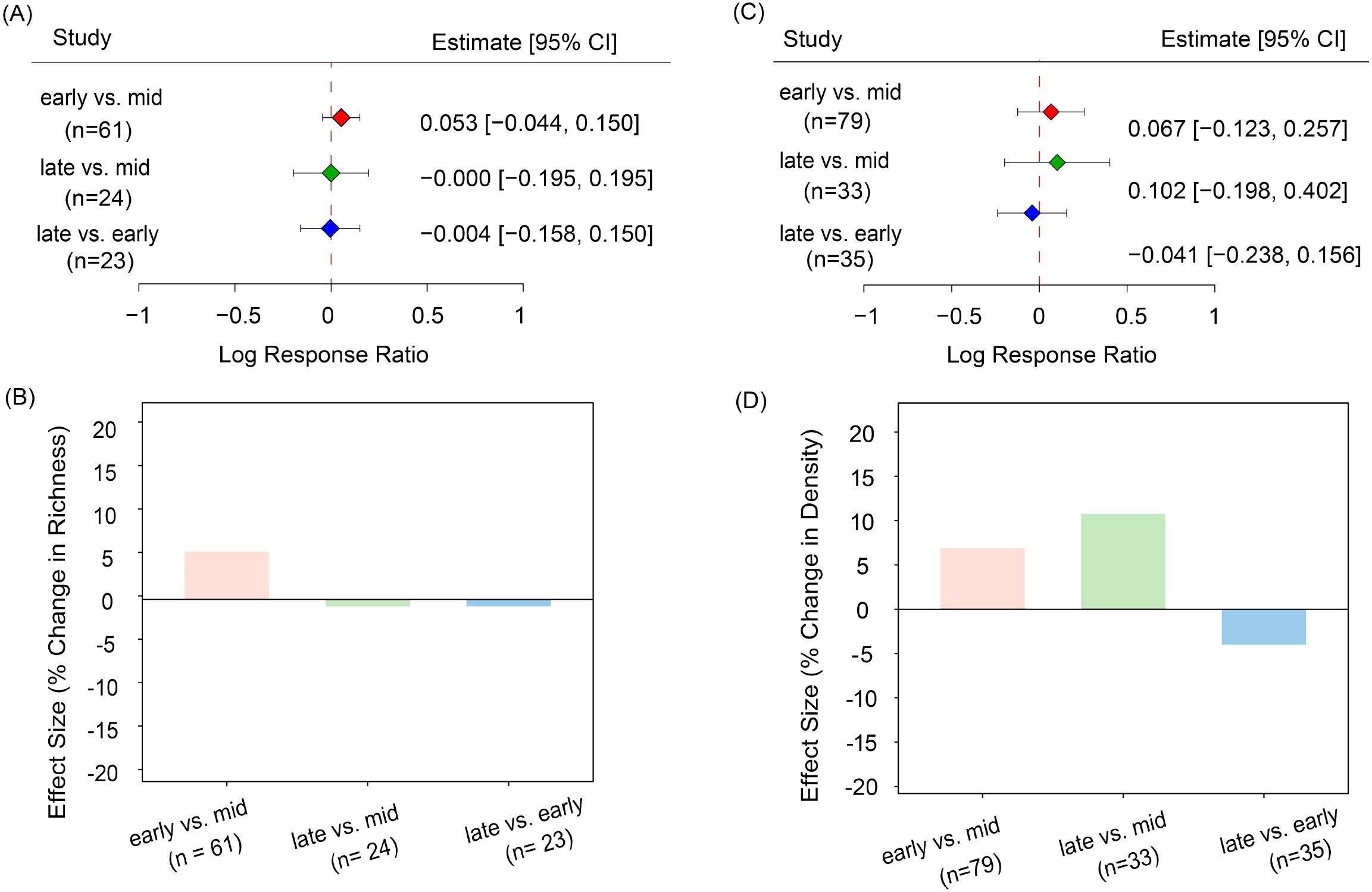 Figure 2. Pairwise effect sizes (log response ratios) for soil seed bank species richness and seed density between growing-season stages. (A) Effect sizes for species richness; (B) percentage change in species richness derived from pairwise effect sizes; (C) effect sizes for seed density; (D) percentage change in seed density derived from pairwise effect sizes. Each point represents the estimated effect size (Log Response Ratio), with error bars indicating the 95% confidence interval (CI). Colors distinguish different comparison groups: red for early-growing season vs. mid-growing season, green for late-growing season vs. mid-growing season, and blue for late-growing season vs. early-growing season.