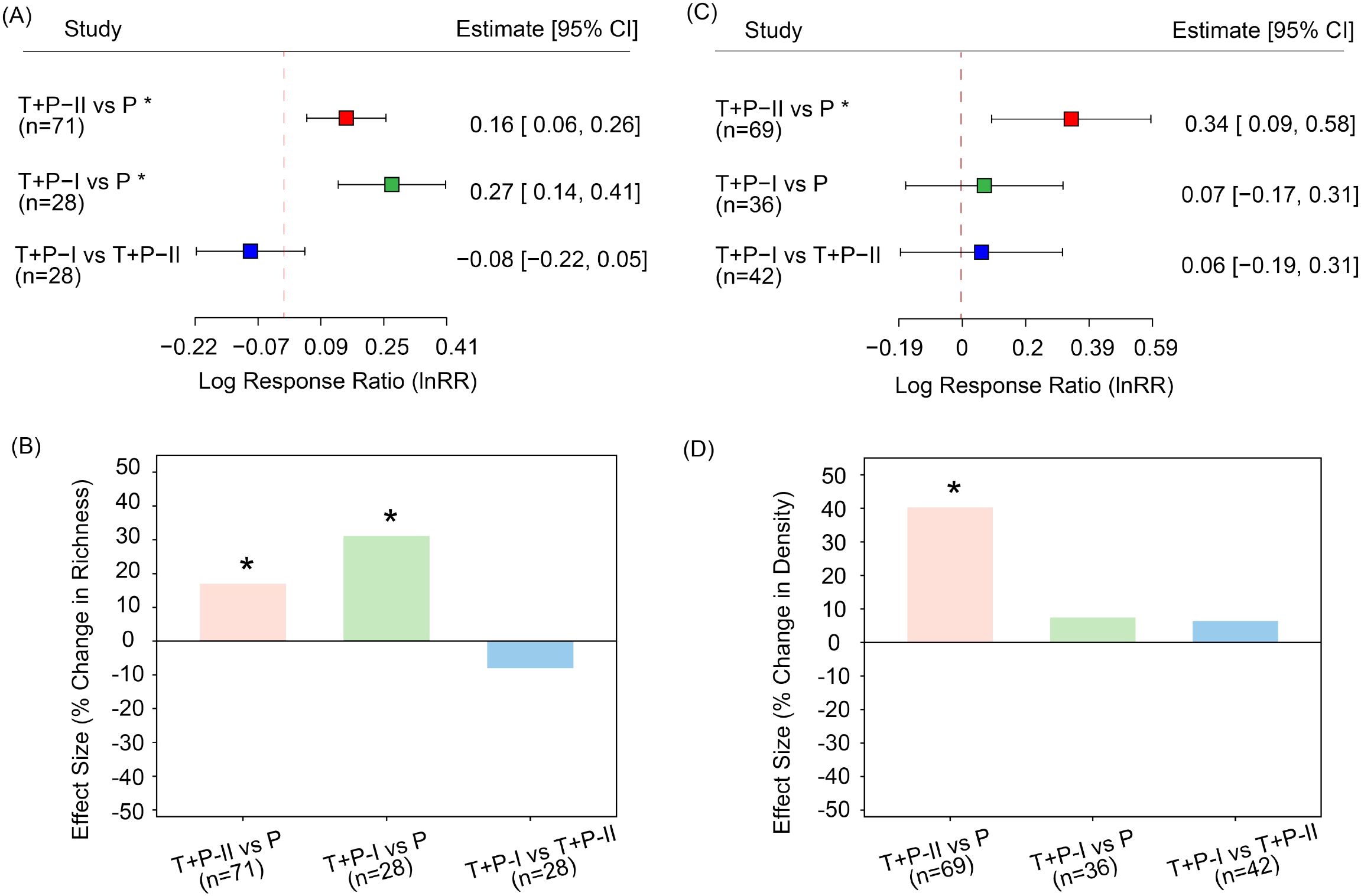 Figure 3. Pairwise comparisons of seed bank types. Panel (A) shows species richness for each pairwise comparison, and panel (B) shows the corresponding percentage change in species richness. Panel (C) shows seed density for each pairwise comparison, and panel (D) shows the percentage change in seed density. Asterisks (*) indicate statistically significant differences between the two compared stages (P< 0.05), and n represents the number of pairwise comparisons included. Based on the classification in the original literature, soil seed banks can be categorized into three types according to the sequence of the growing season: early-growing season (transient type II, T+P-II); mid-growing season (persistent type, P); and late-growing season (transient type I, T+P-I).