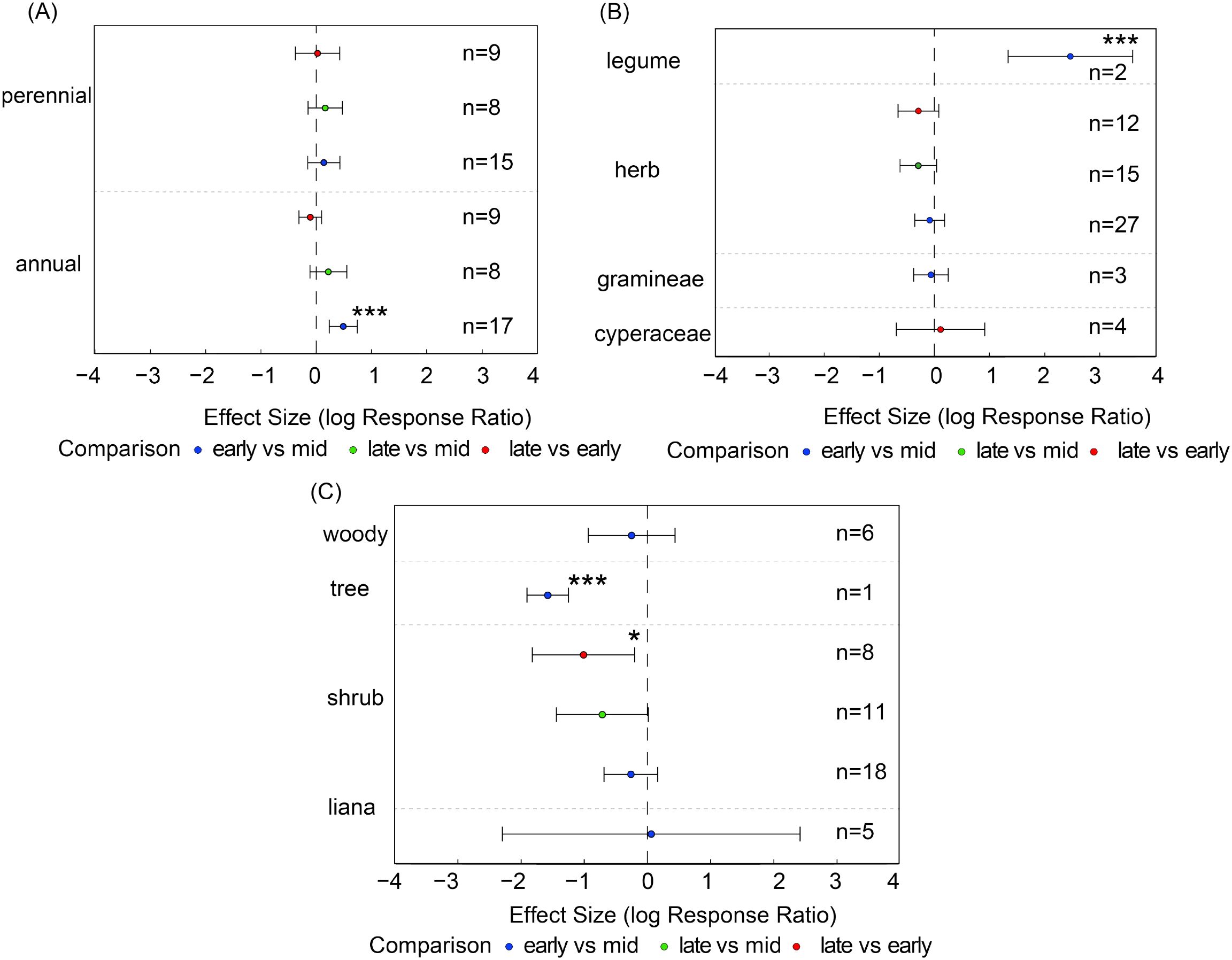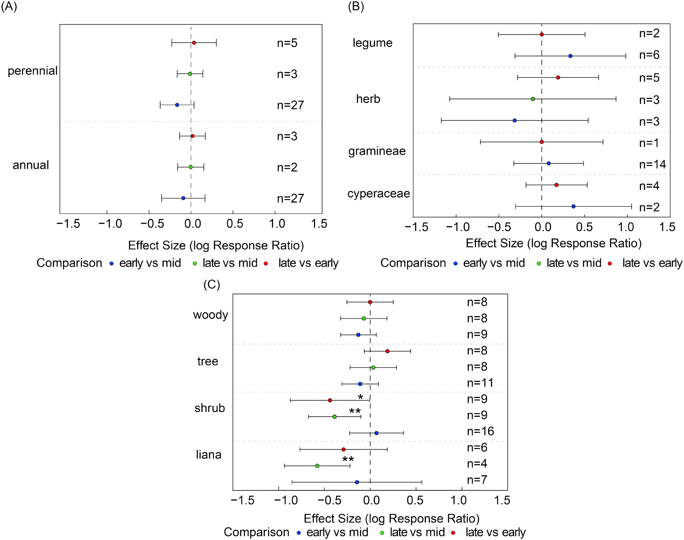 Figure 4. For each functional group, species richness was compared pairwise between growth stages. Panels show species richness of (A) life-history types (annuals, perennials), (B) major plant groups (Gramineae, Cyperaceae, Leguminosae, other herbs), and (C) growth forms (shrubs, trees, woody species, liana). Points show effect estimates with 95% confidence intervals. Blue indicates comparisons between early- and mid-growing seasons, orange indicates comparisons between late- and mid-growing seasons, and green indicates comparisons between late- and early-growing seasons. Asterisks denote significance levels (*P < 0.05, **P < 0.01, and n represents the number of samples.