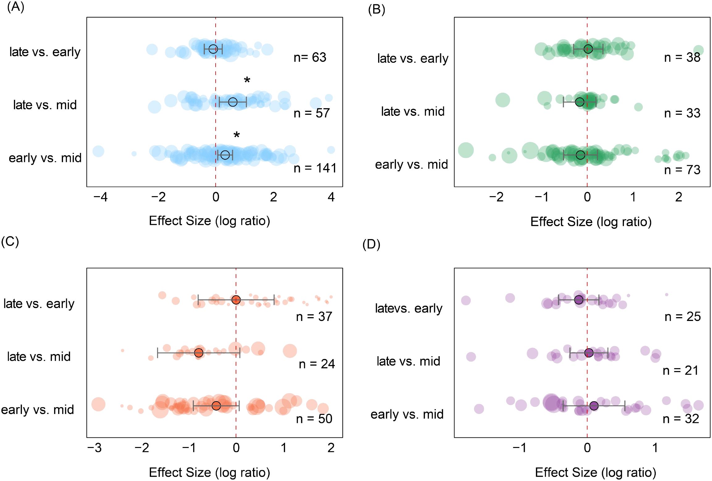 Figure 6. Changes in soil seed bank species richness across ecosystems based on pairwise comparisons between growing-season stages. (A) grassland; (B) forest; (C) shrubland; (D) farmland. Each point represents the effect size between two growing-season stages. Error bars denote 95% confidence intervals. Circle size corresponds to sample size in the respective comparison, with larger circles indicating greater sample numbers, and n represents the number of samples. Asterisks indicate statistical significance levels (*P < 0.05,).