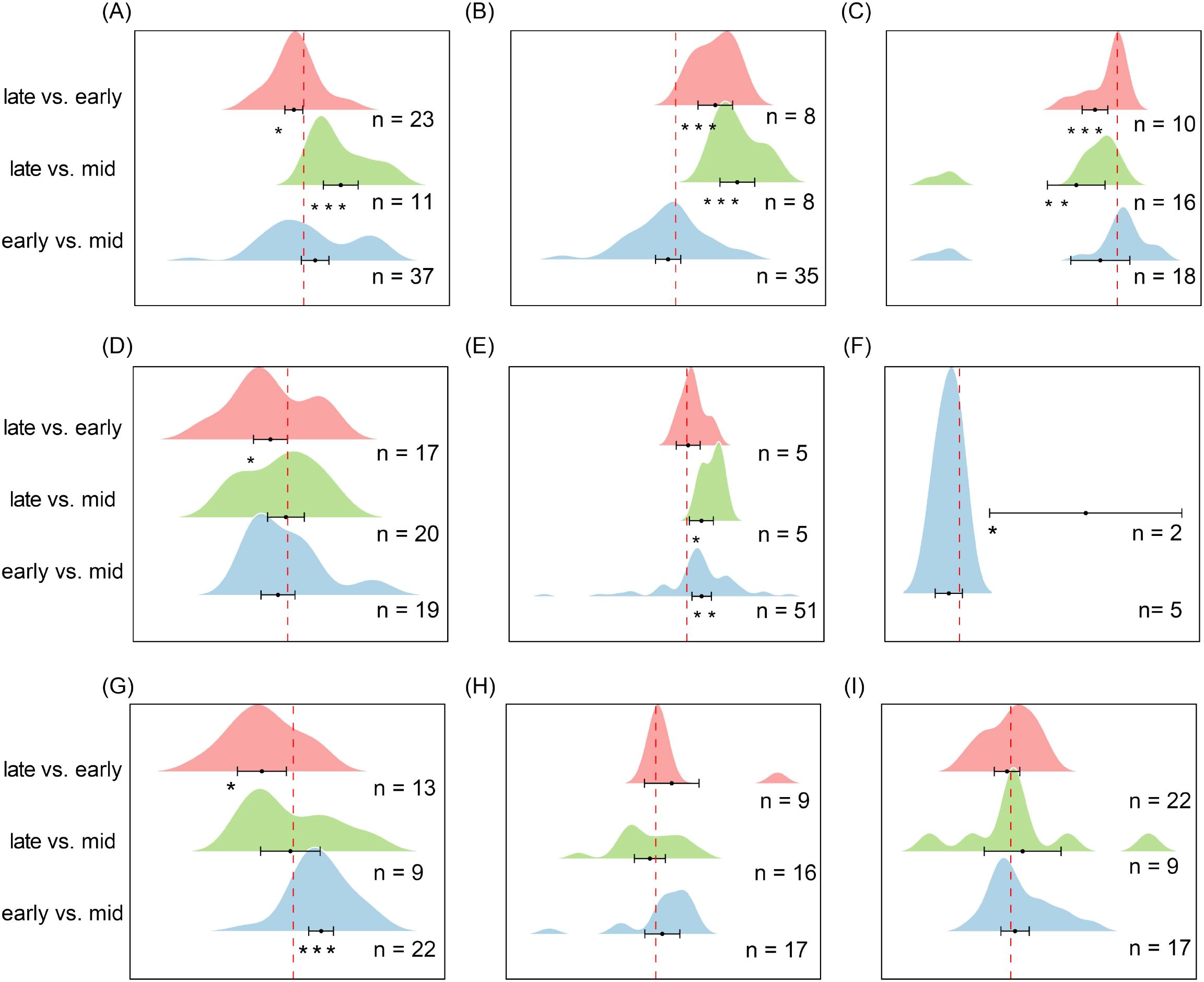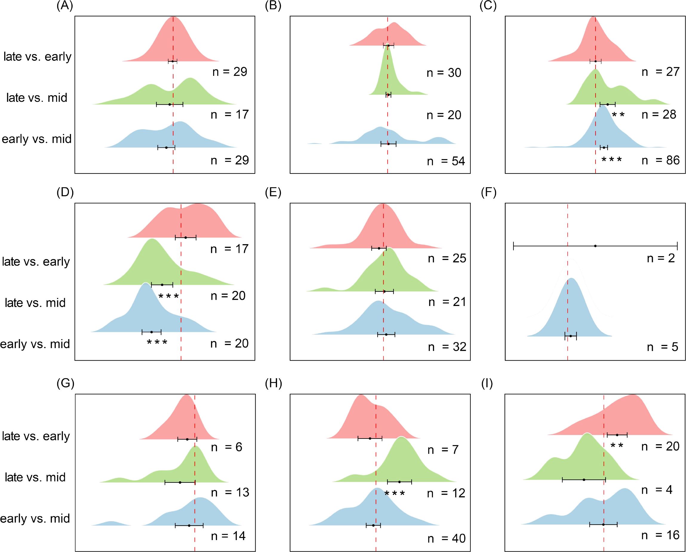 Figure 8. Pairwise comparisons of seed richness in soil seed banks across different ecosystems during successive stages of the growing season. (A) Alpine Meadow, (B) Temperate Deciduous Forest, (C) Tropical/Subtropical Forest, (D) Temperate Shrubland, (E) Temperate Steppe Grassland, (F) Boreal Fores, (G) Cropland, (H) Savannah, (I) Mediterranean Shrubland. Each ridge plot shows the distribution of effect sizes (log response ratios) across studies for three pairwise comparisons: early- vs. mid-season, late- vs. mid-season, and late- vs. early-season. Peaks indicate where most studies’ effect sizes are concentrated. Black dots represent the mean effect size for each comparison, with horizontal black lines indicating 95% confidence intervals. Sample sizes (n) are shown for each comparison, and asterisks (*) denote statistically significant differences (P < 0.05). This figure reflects species composition (richness), complementing Figure 9, which reflects seed abundance (density). ** P < 0.01, *** P < 0.001, indicating significant differences between treatments or groups.