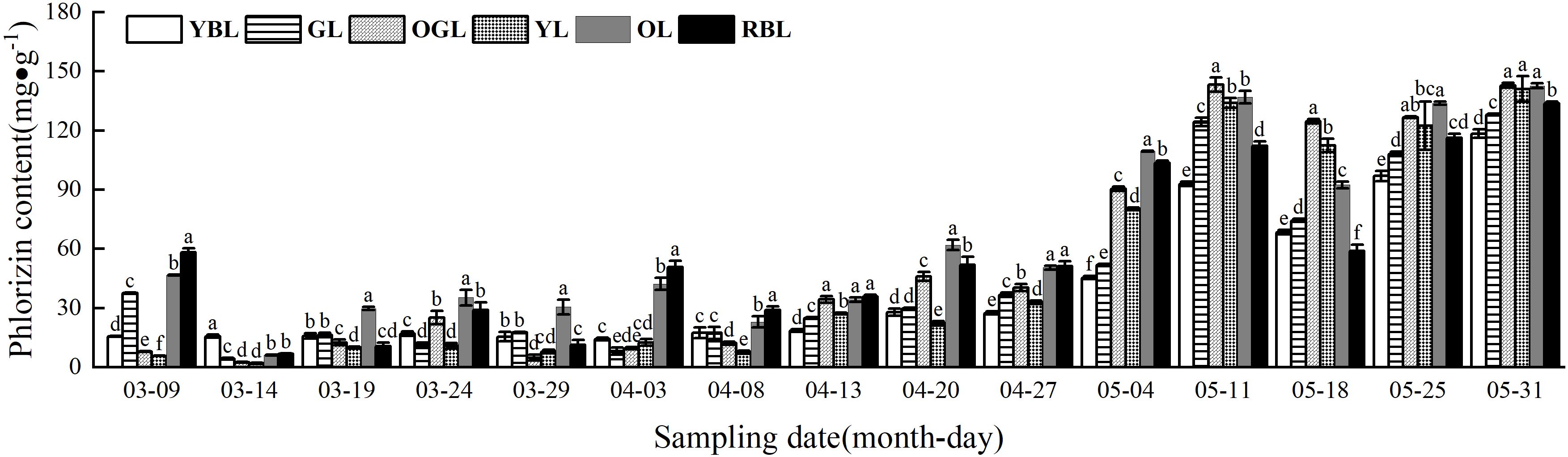 Bar graph showing the phlorizin content in milligrams per gram for different leaf types (YBL, GL, OGL, YL, OL, RBL) across various sampling dates from March ninth to May thirty-first. The content varies, increasing significantly over time, with RBL generally displaying the highest values and others fluctuating. Each bar is labeled with letters indicating statistical significance differences.