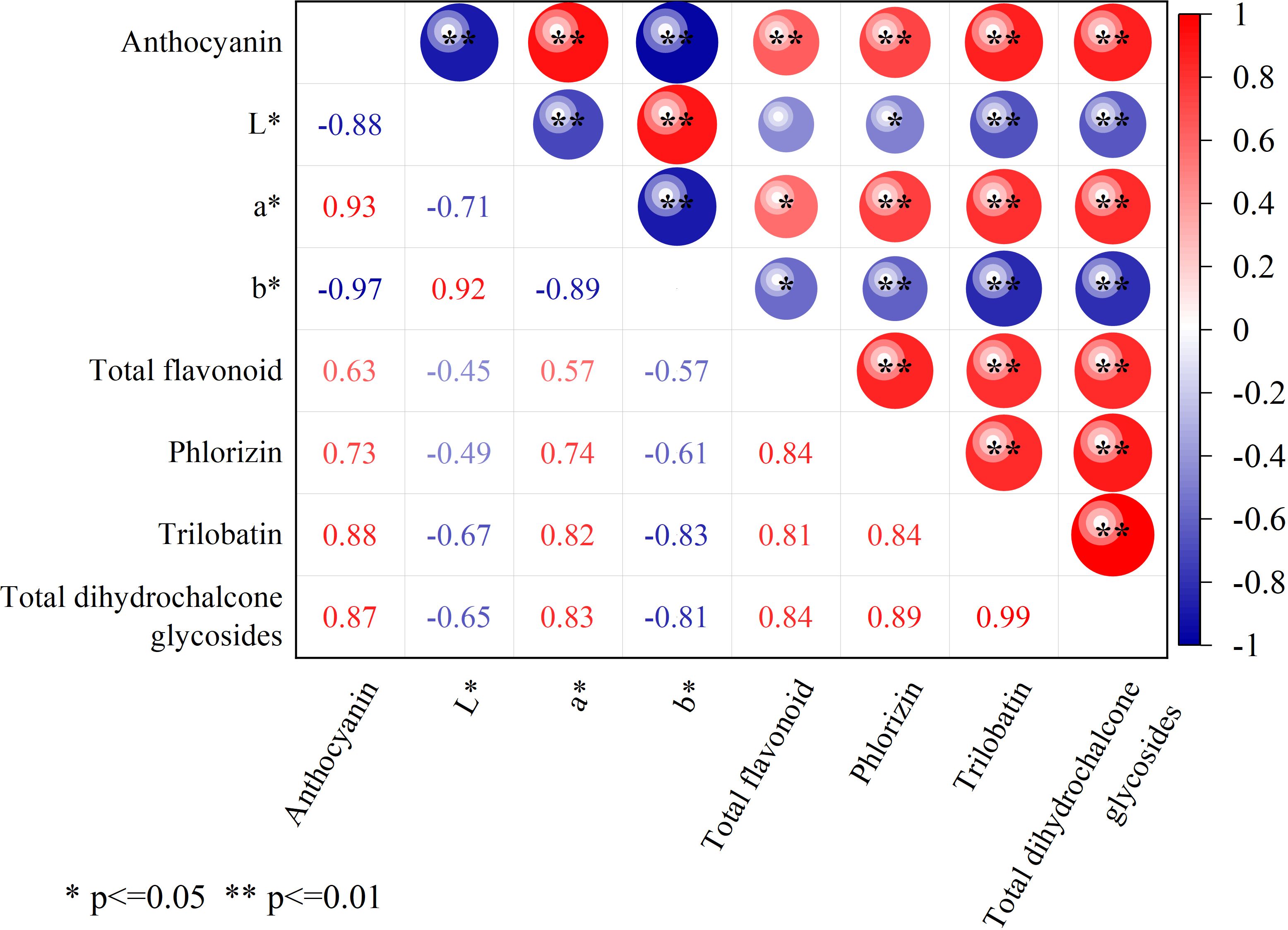 Correlation matrix with colored circles representing correlation strength and direction between variables: Anthocyanin, L*, a*, b*, total flavonoid, phlorizin, trilobatin, and total dihydrochalcone glycosides. Scale from -1 (blue) to 1 (red). Significant correlations are marked with asterisks; single for p ≤ 0.05, double for p ≤ 0.01.
