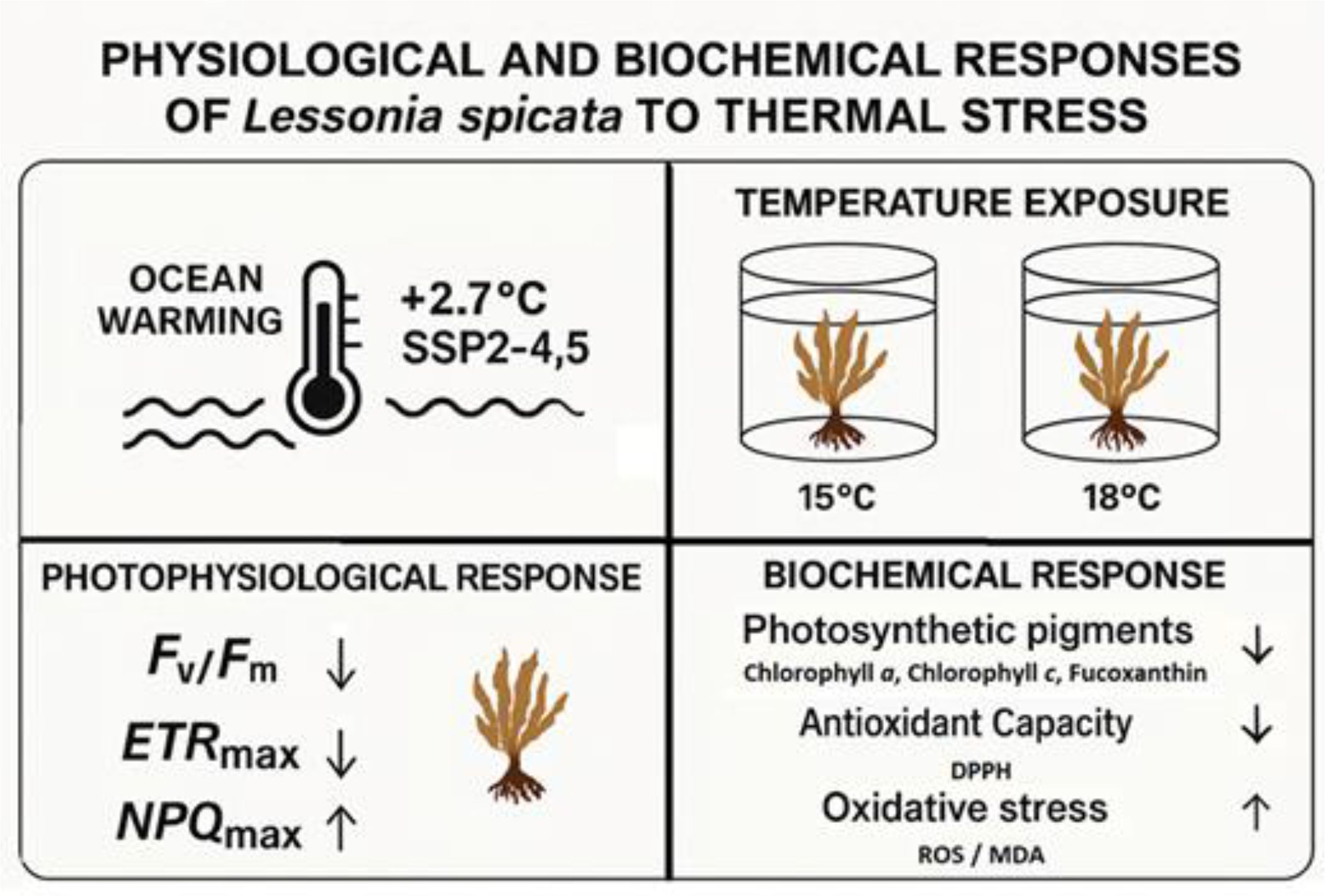 Given regional warming trends and the increasing frequency of marine heat anomalies along central Chile, we tested a +3°C increment relative to 15°C to represent a realistic, short-term thermal stressor. This short-term stress is relevant because the degree of cellular damage and redox imbalance measured here is the mechanistic foundation that determines longer-term organismal fitness and demographic performance under chronic or repeated stress, as physiological responses underpin individual life-history traits and, consequently, population dynamics (Coleman, 2024). Our objective was strictly mechanistic: to quantify short-term photophysiological and biochemical responses of L. spicata to moderate warming under controlled conditions.