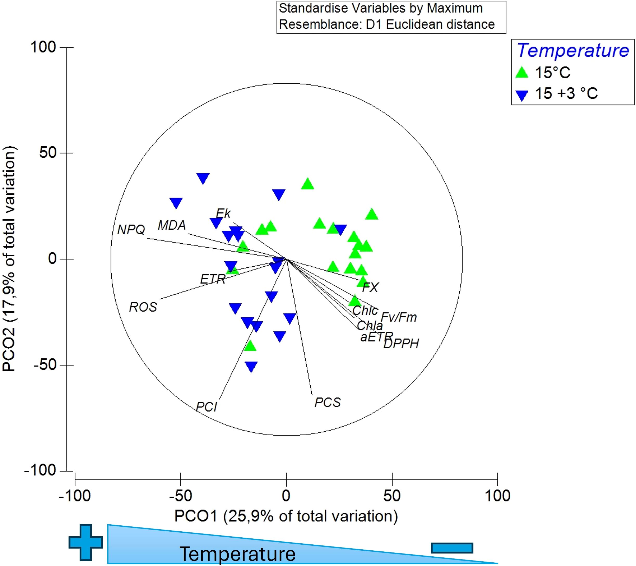 Figure 2. Principal Coordinates Ordination (PCO) of all photophysiological and biochemical variables. The ordination shows the separation between the 15°C (green triangles) and 18 °C (blue inverted triangles) treatments. Vectors indicate the contribution and direction of each variable. PCO1 and PCO2 explain 25.9% and 17.9% of the total variance, respectively.
