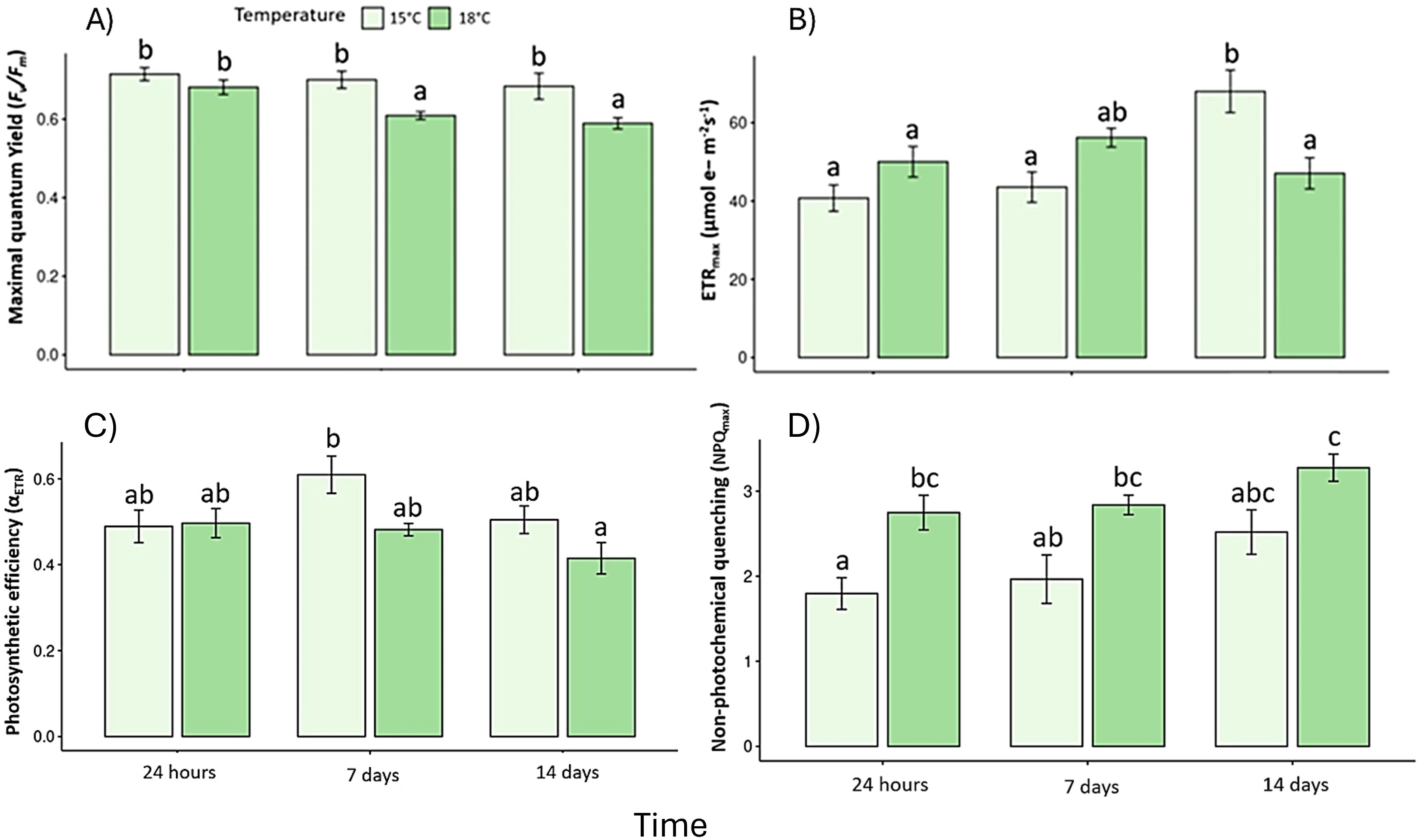 Figure 3. Photophysiological responses: (A) Maximal quantum yield (Fv/Fm), (B) maximal electron transport rate (ETRmax). (C) Photosynthetic efficiency (αETR) and (D) Maximal non-photochemical quenching (NPQmax). Lowercase letters denote significance after the SNK test.