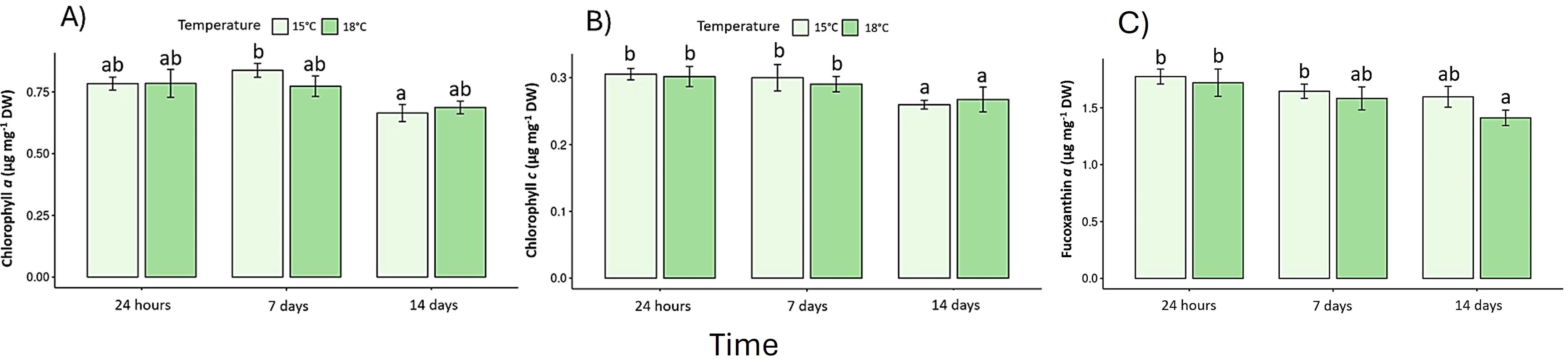 Figure 4. Photosynthetic pigments: (A) Chlorophyll a and (B) Chlorophyll c (c1+c2) and (C) Fucoxanthin pigment content. Lowercase letters denote significance after the SNK test.