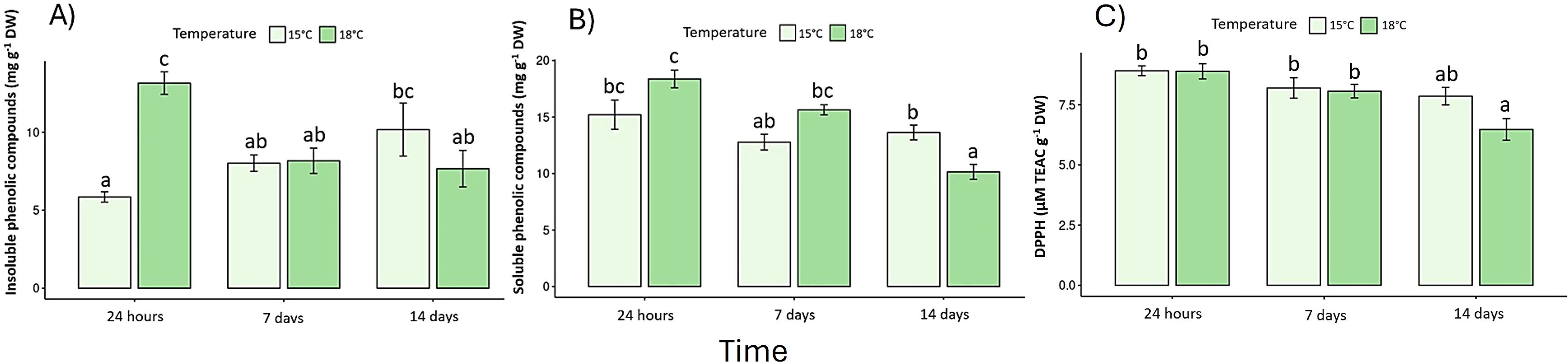 Figure 5. Phenolic compounds: (A) Insoluble phenolic content, (B) Soluble phenolic content, and (C) Total antioxidant capacity, measured by the DPPH assay and expressed as Trolox equivalents. Lowercase letters denote significance after the SNK test.