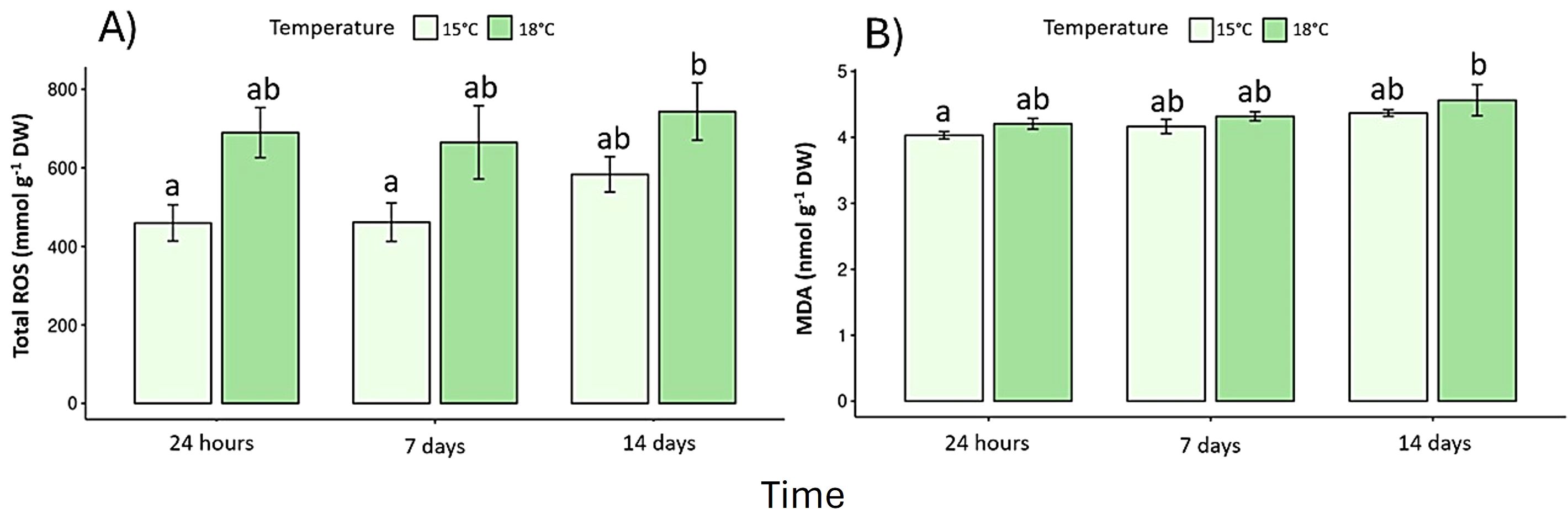 Pigment content declined under elevated temperature (Supplementary Table S2). Chlorophyll a decreased by 32% and chlorophyll c by 27% after 14 days at 18 °C (p < 0.05) (Figures 4A, B), whereas fucoxanthin declined by 23%, confirming pigment degradation (Figure 4C). In the same context, photoprotection as phenolic compounds exhibited a biphasic response: a transient rise at 24 h under 18 °C (early stress activation; F (2, 30) = 13.7, p < 0.05) (Figures 5A, B), followed by a pronounced decrease on day-14. Antioxidant capacity (DPPH assay) dropped by 40% relative to the control (p < 0.05) (Figure 5C), while reactive oxygen species (ROS) (Figure 6A) and malondialdehyde (MDA) (Figure 6B) increased ~60% and 45%, respectively (p < 0.05) (Figure 6).
