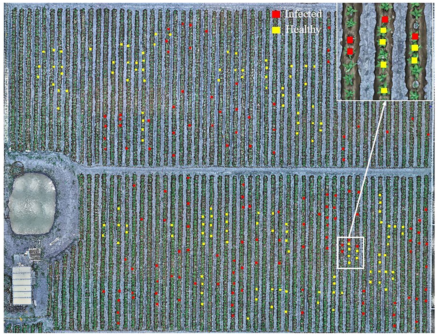 Infection by plant diseases can induce significant alterations in the biophysical and biochemical properties of plants, including modifications in tissue structure, intercellular space, transpiration rate, pigment content, and water content (Slaton et al., 2001; Rumpf et al., 2010). These physiological and structural changes often manifest as variations in the spectral characteristics of plants, which can be effectively captured using hyperspectral imaging platforms (Zarco-Tejada et al., 2013). Extensive research has been conducted on the application of hyperspectral imaging for the identification of viral diseases in tobacco at the leaf scale. For instance. For instance, the Successful Projects Algorithm (SPA) was employed to extract characteristic spectral wavelengths at 554.07, 574.31, 760.16, 791.78, 839.55, and 936.33 nm at the leaf scale for identifying TSWV-infected tobacco leaves, achieving the highest accuracy of 85.2% when coupled with the Boosted Regression Trees (BRT) model (Gu et al., 2019) Similarly, hyperspectral reflectance data within the visible and near-infrared spectral ranges have been demonstrated to differentiate between TSWV-infected and healthy tobacco leaves (Zhu et al., 2017). By applying statistical analysis methods, they were able to detect the progression of TSWV infection in tobacco plants, identifying measurable differences between infected and healthy plants as early as 14 days post-infection. These studies underscore the potential of hyperspectral imaging as a powerful tool for early and accurate detection of plant diseases, particularly in the context of tobacco viral infections. However, current research efforts have predominantly focused on TSWV identification utilizing stationary hyperspectral imaging systems at the leaf scale under controlled conditions. While these methodologies enable the acquisition of sub-millimeter resolution spectral data, facilitating the precise detection of early disease symptoms including leaf vein discoloration and small disease spots (Abdulridha et al., 2020), the inherent limitations of single-leaf scanning approaches, particularly their labor-intensive and time-consuming procedures, coupled with their failure to effectively address field-scale challenges such as mixed pixels and complex canopy structure, render them impractical for large-scale field applications (Zhao et al., 2022).