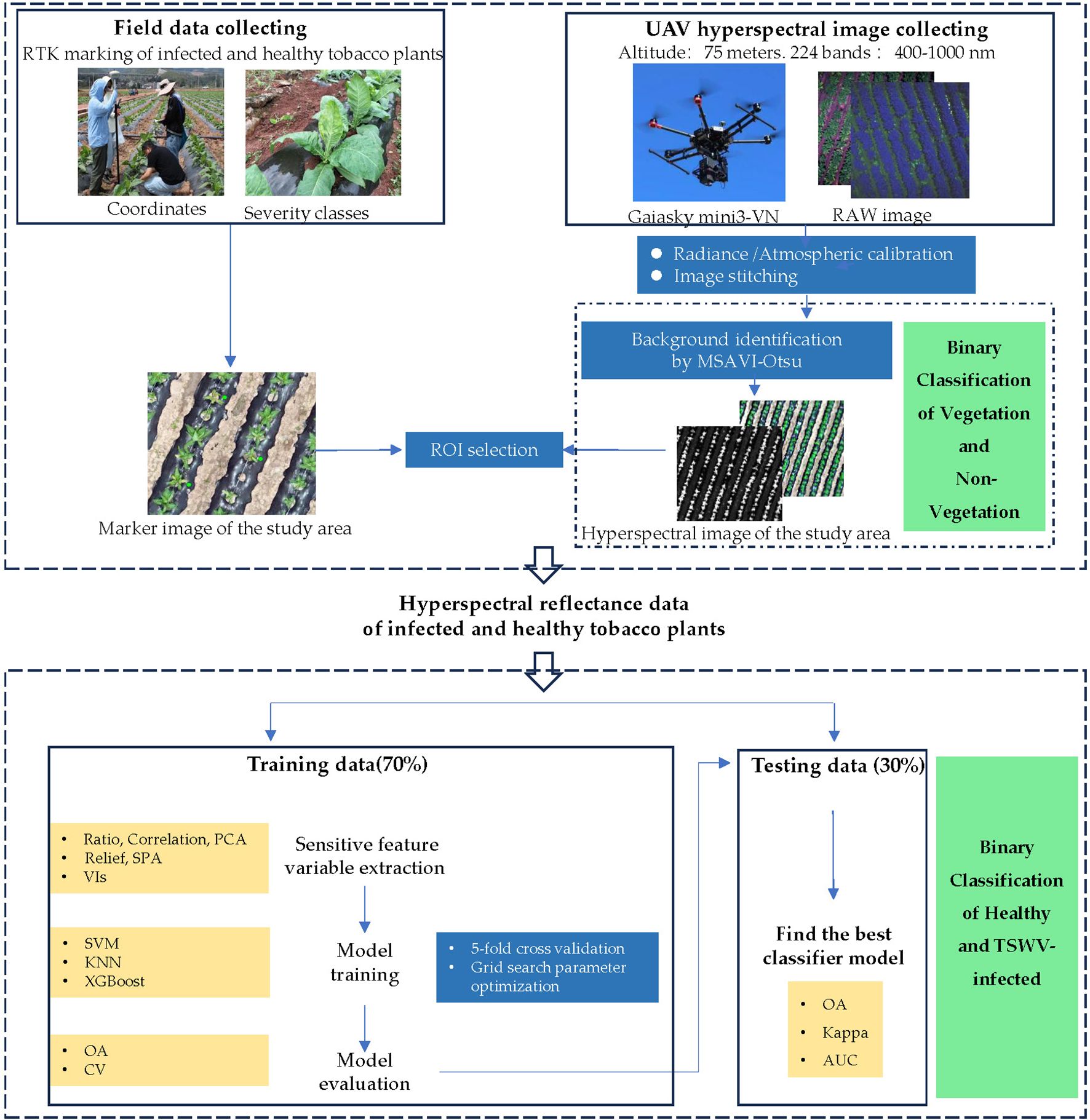 Problems: Tomato Spotted Wilt Virus (TSWV) severely affects tobacco yield and quality, creating an urgent need for accurate, rapid, non-destructive monitoring to support disease management. While existing TSWV detection methods perform well at the leaf scale, their field-scale application remains challenging. Due to complex crop canopy structures, spectral characteristics at the field level differ significantly from leaf-level observations, and TSWV-sensitive spectral features are still unclear. This study therefore aims to develop a field-scale TSWV identification model using UAV-based hyperspectral imaging to enable targeted disease control.