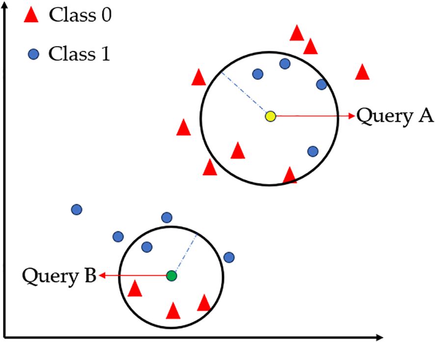 The k-nearest neighbor (KNN) algorithm was first proposed by Fix and Hodges (Fix, 1985). The principle of the KNN classifier is to find the nearest training sample for the test sample through distance measurement, and decide the class of the test sample based on the class of the training sample. The KNN algorithm is based on this principle. Given the class of training sample labels, it searches for the k most similar or nearest training samples of the test sample, and then decides the class of the test sample based on the k nearest training sample classes. As shown in Figure 7 (Uddin et al., 2022), two clustering regions (Class 0/Class 1) are represented by red triangles and blue circles, respectively. When the query point Query A is positioned near the Class 1 cluster, it is classified as Class 1 (determined by the density of neighboring points), while Query B follows the same principle. This intuitively demonstrates KNN’s core mechanism based on local majority voting (Deng et al., 2016). The practical efficacy of this algorithm is highlighted by a model combining InceptionResNetV2 and KNN, which achieved 99.00% accuracy in classifying okra plants infected with yellow vein mosaic virus (Mittal et al., 2024).