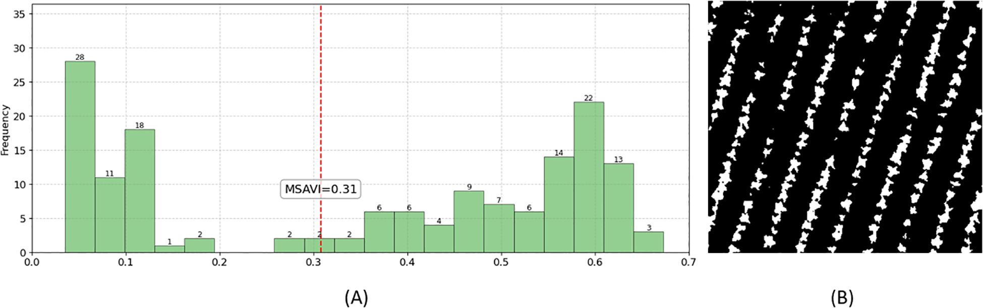 Figure 9. Background mask generated by the MSAVI-Otsu method. (A) Threshold determination using MSAVI-Otsu; (B) Resulting background mask image.