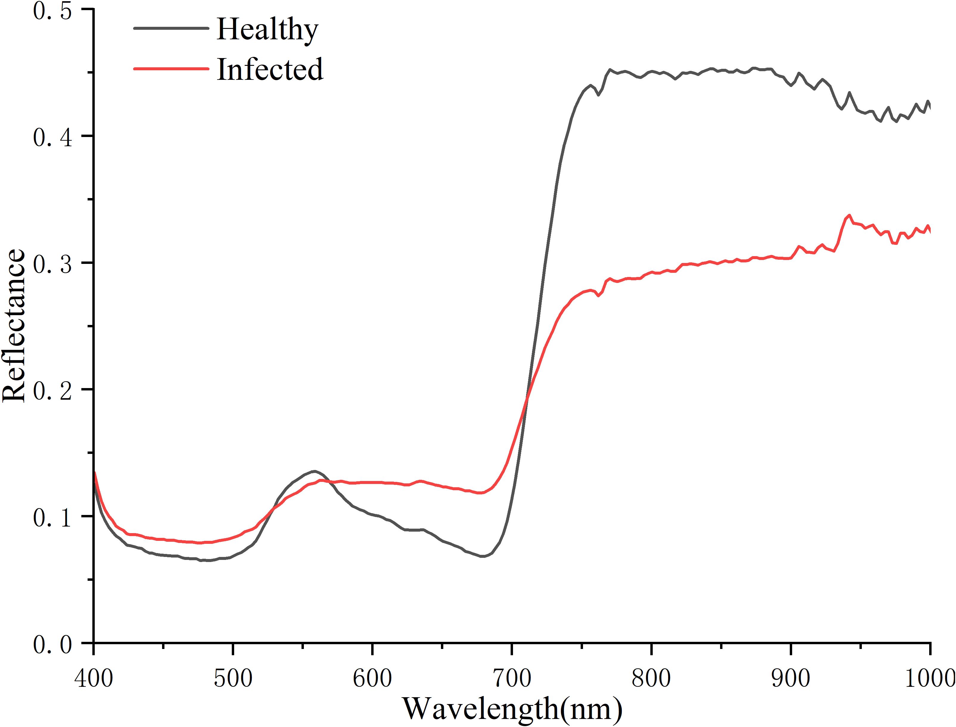 The invasion of pathogens into plant leaves leads to the occurrence of their physiological characteristics, which is the basis for remote sensing to identify healthy and diseased plants (Zarco-Tejada et al., 2013). This study compared and analyzed the hyperspectral reflectance of healthy and infected tobacco plants and found that there were significant differences in spectral reflectance between healthy and infected tobacco plants in the visible red-light region, red-edge region, and NIR region. Similar spectral feature differences were also found in the identification of tomato bacterial spot disease (Abdulridha et al., 2020) and wheat scab (Bauriegel et al., 2011).