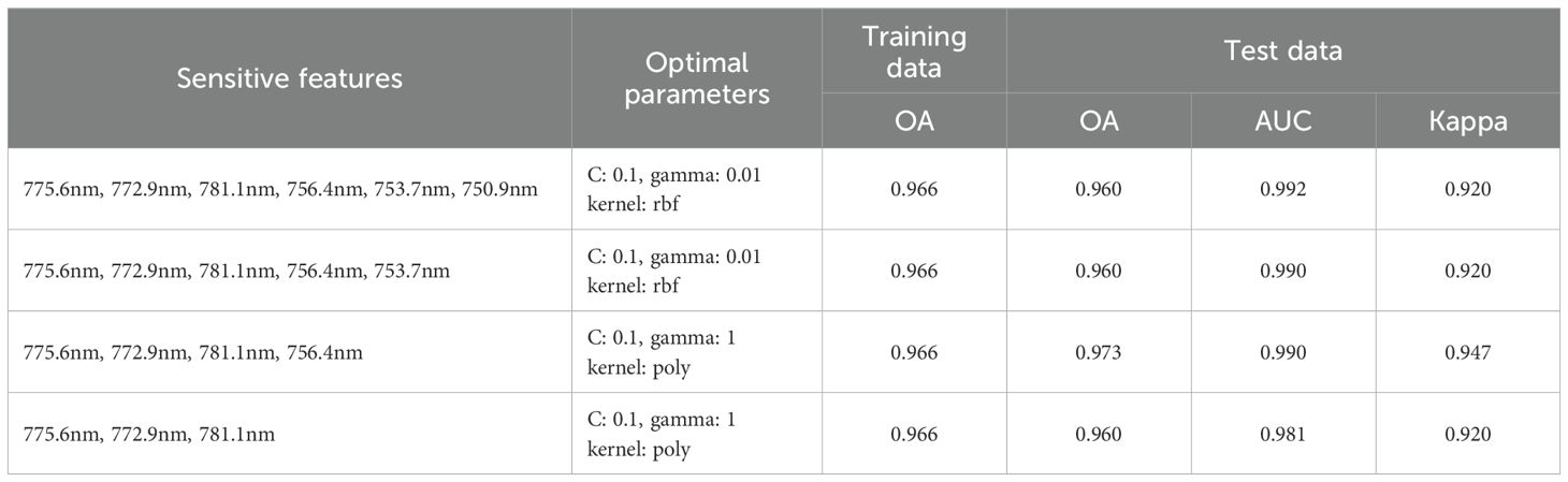Based on the best-performing SVM-Relief combination, to further reduce the feature dimensionality and improve model performance, a composite feature extraction strategy (termed RPR) was adopted. The approach first applied PCA to reduce the dimensionality of the features extracted by Relief. Then, RFE based on SVM was used to iteratively remove features according to their importance and select the feature subset with the OA, which was subsequently evaluated on the test set. PCA results indicated that the first principal component (PC1) accounted for 99.8% of the cumulative variance contribution. The top six spectral indicators with the highest loadings in PC1 (775.6/772.9/781.1/756.4/753.7/750.9 nm) were selected as input features for RFE. As shown in Table 4, when the number of features was gradually reduced from six to three, the OA on the training set remained consistently at 96.6%. When the feature set was reduced to four indicators (775.6/772.9/781.1/756.4 nm), the model achieved optimal performance on the test set (OA = 97.3%, Kappa = 0.947, AUC = 0.990), which was comparable to the performance obtained using all 15 original features.