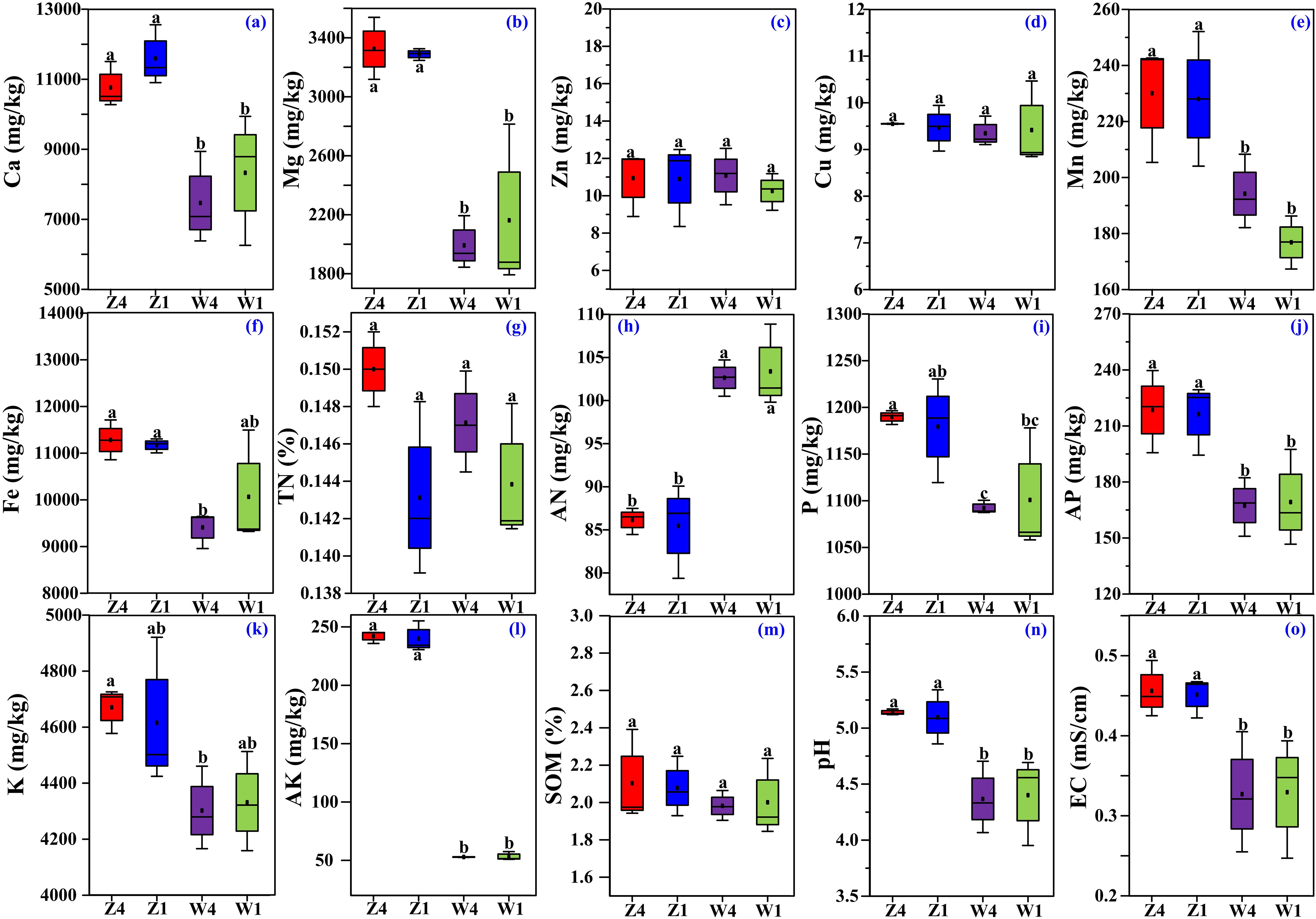 Figure 1. Basic physicochemical properties of rhizosphere soils, including concentrations of Ca (a), Mg (b), Zn (c), Cu (d), Mn (e), Fe (f), total N (TN, g), alkaline hydrolyzable N (AN, h), total P (i), available P (AP, j), total K (k), available K (AK, l), and soil organic matter (SOM, m), soil pH (n) and soil EC (o). Different lowercase letters indicate significant differences (p ≤ 0.05, one-way ANOVA with Tukey’s test). Z1, Z4, W1, and W4 represent the rhizosphere soils of variety T1at site Z, variety T4 at site Z, variety T1 at site W, and variety T4 at site W, respectively.