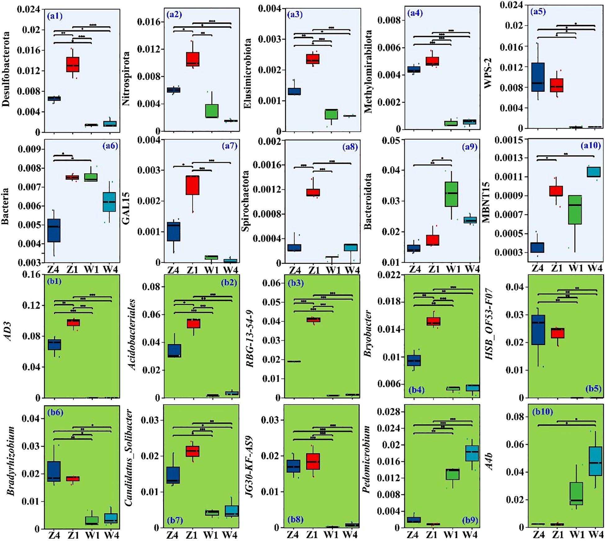 Figure 2. Relative abundances of Top10 phyla (a1-a10) and Top10 genera (b1-b10). ** and * indicate significant differences at p ≤ 0.05 and p ≤ 0.01, respectively. Z1, Z4, W1, and W4 are as defined in Figure 1.