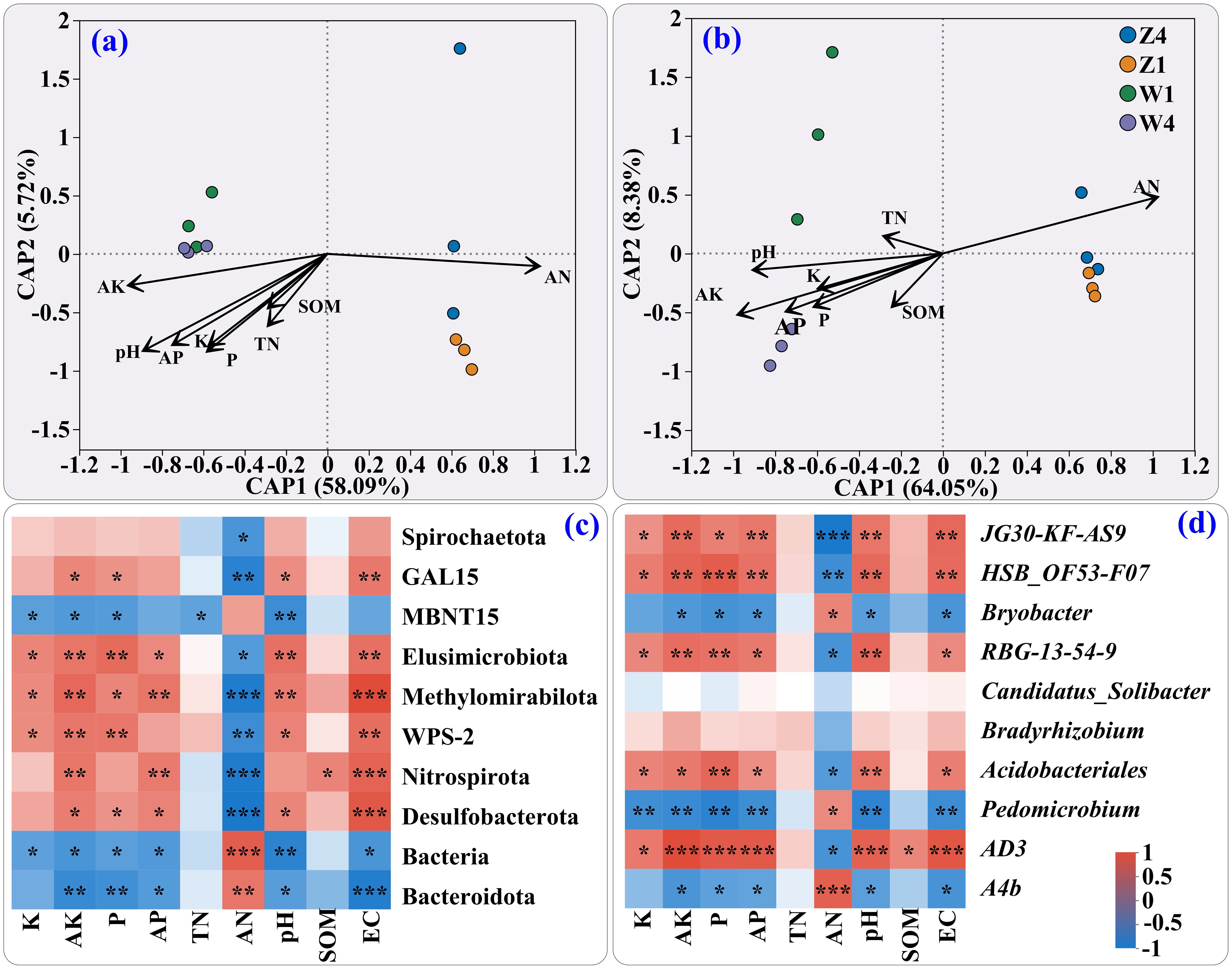 Redundancy analysis (RDA) at the phylum level (Figure 3a) showed that CAP1 (58.09%) and CAP2 (5.72%) explained 63.81% of the community variation. At the genus level (Figure 3b), the ordination axes CAP1 (64.05%) and CAP2 (8.38%) explained 72.43%. AN, AK, and pH were the primary driving factors, with clear separation between Z and W sites.