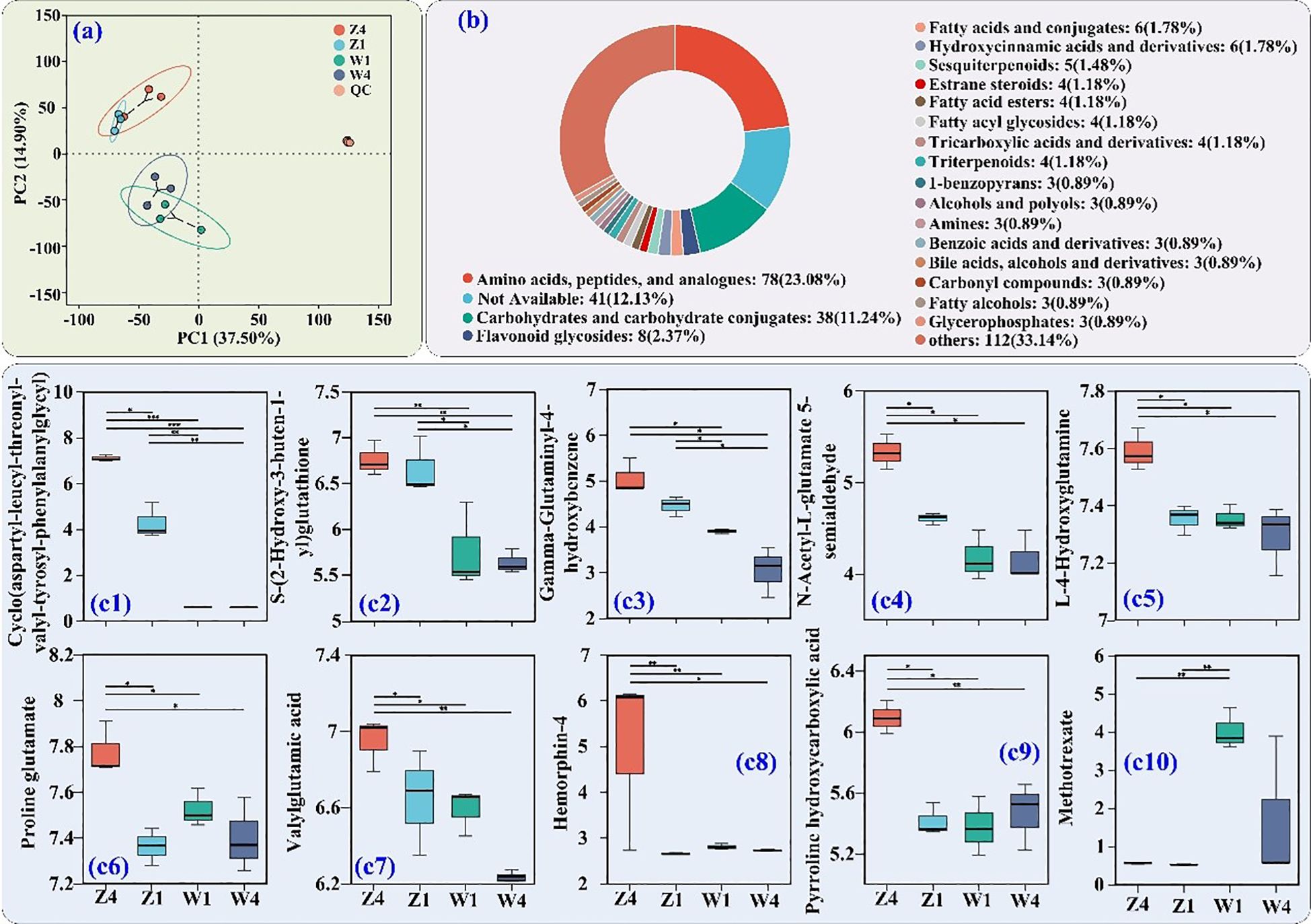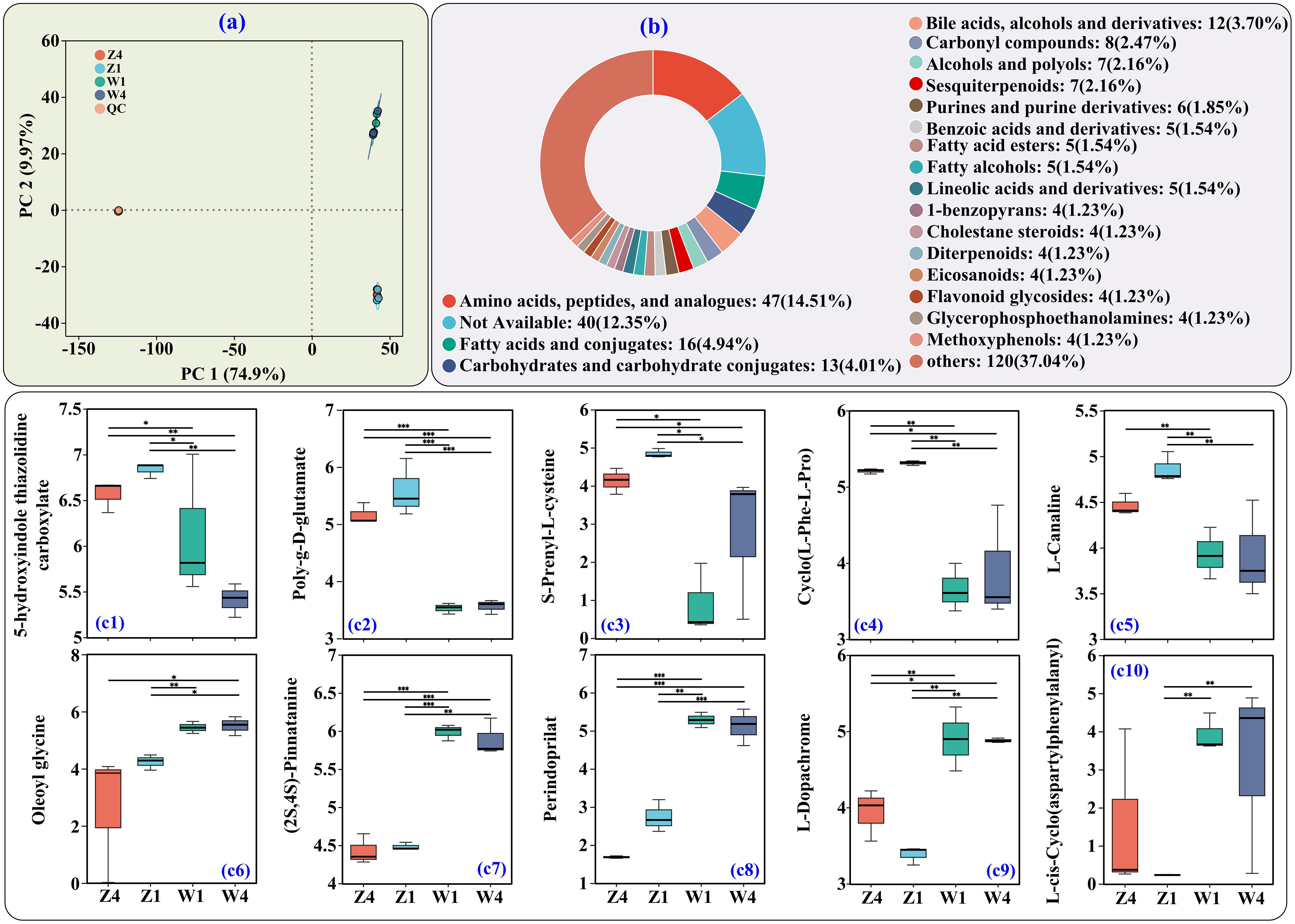 Figure 4. Untargeted metabolomics analysis of PSH rhizosphere soils. (a) Principal coordinate analysis (PCoA). (b) HMDB classification of differential metabolites (DMs) at the subclass level. (c1–c10) Relative abundances of the top 10 DMs (by VIP value) belonging to amino acids/peptides and analogs. *, **, and *** indicate significance at adjusted p < 0.05, < 0.01, and < 0.001, respectively (n = 3). Y-axis shows log10 transformed relative abundance. Z1, Z4, W1, and W4 are as defined previously.