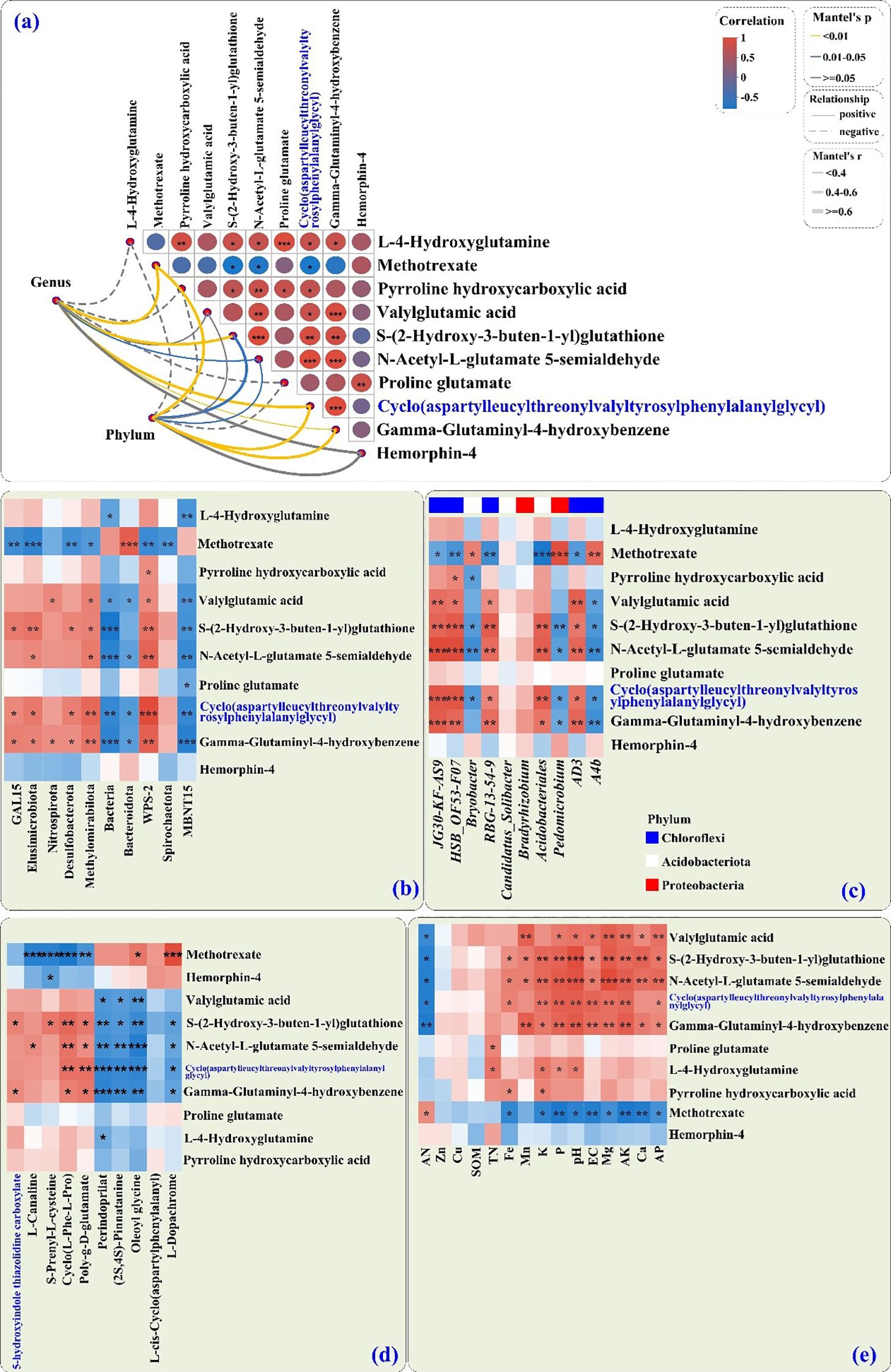 Figure 6. The bacterial community composition (measured by the Bray–Curtis distance) was correlated with metabolites (TOP10 VIP values) in PSH tuberous roots on the basis of Mantel tests (a). The edge width represents Mantel’s r statistic results, with larger values of r indicating a stronger response to lead. The type of edge indicates statistical significance, with solid edges representing positive correlations and dashed edges signifying negative correlations. Spearman correlation analysis was conducted to examine the relationships (1) between soil-dominant microbial communities [phylum (b) and genus (c) levels] and amino acids/peptides and analogs in PSH roots; (2) between the abundance of soil differentially abundant metabolites and amino acids/peptides and analogs in PSH roots (d); and (3) between soil physicochemical properties and amino acids/peptides and analogs in PSH roots (e). The transition from dark blue to light blue indicates a negative correlation, whereas the shift from light red to dark red signifies a positive correlation. Significance levels and sample labels as in Figure 3.