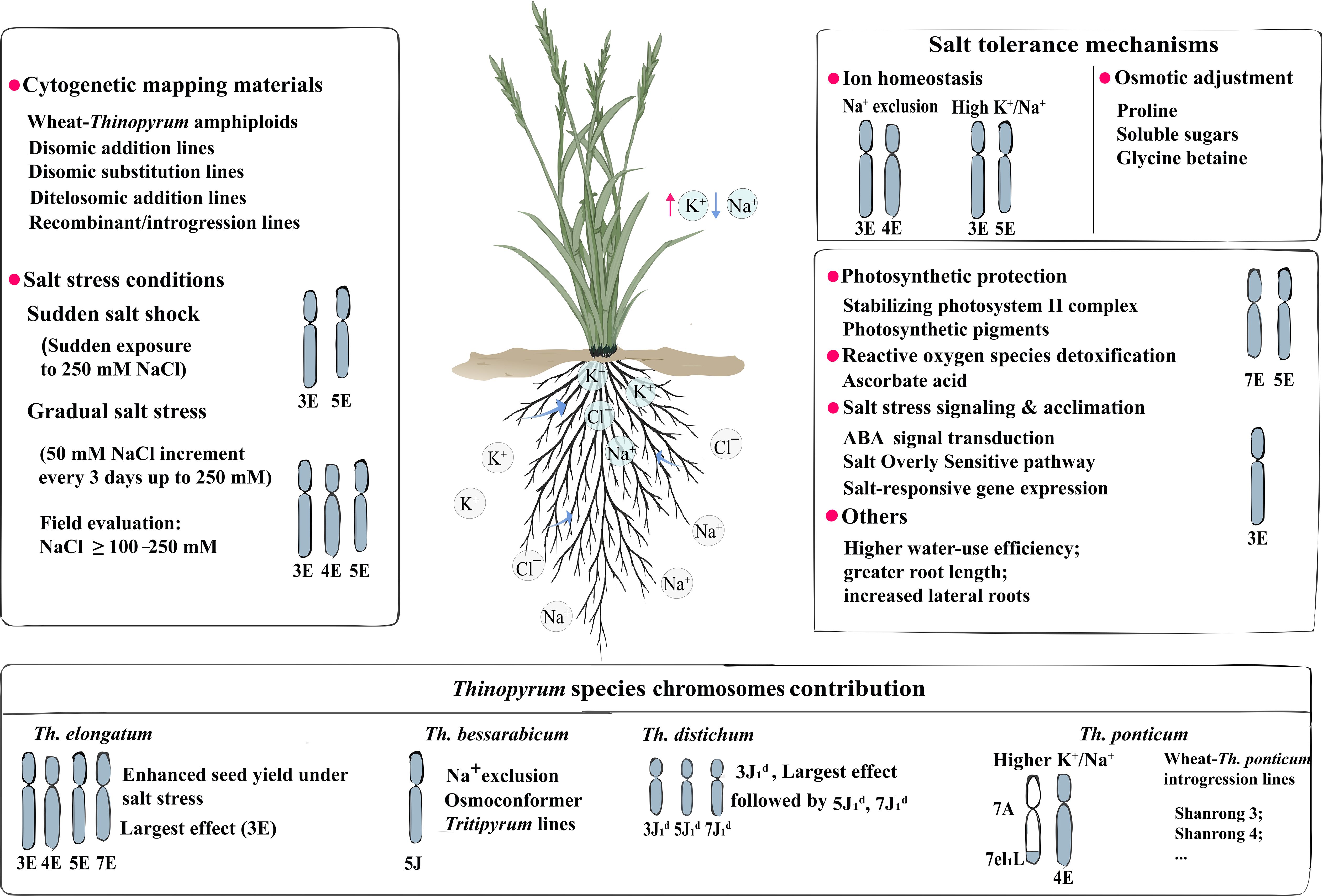 Figure 1. Mechanisms and chromosomes (segments) regulating salt tolerance in Thinopyrum species. The upper two boxes were principally summarized from Th. elongatum.