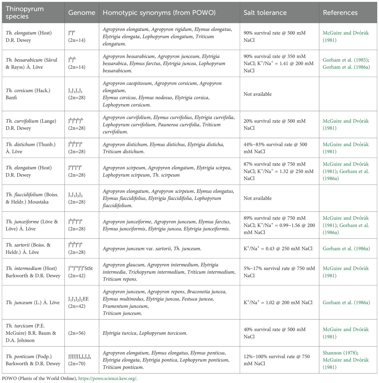 Genus Thinopyrum Á. Löve, erected in 1980 (Löve, 1980), consists of the species with E or J (= Eb) genome which have been classified as Triticum, Agropyron, Elymus, Elytrigia, and Lophopyrum previously. For sake of consistency with the existing literature, this paper uses Thinopyrum, notwithstanding the recent adoption of Lophopyrum by Yen and Yang (2022). Thinopyrum species include diploids (2n=14) Th. elongatum (Host) D.R. Dewey and Th. bessarabicum (Săvul. and Rayss) Á. Löve, tetraploids (2n=28) Th. corsicum (Hack.) Banfi, Th. curvifolium (Lange) D.R. Dewey, Th. distichum (Thunb.) Á. Löve, Th. flaccidifolium (Boiss. and Heldr.) Moustaka, Th. junceiforme (Á. Löve and D. Löve) Á. Löve, Th. sartorii (Boiss. and Heldr.) Á. Löve, and Th. elongatum (Host) D.R. Dewey, hexaploids (2n=42) Th. junceum (L.) Á. Löve and Th. intermedium (Host) Barkworth and D.R. Dewey, one octoploid (2n=56) Th. turcicum (P.E. McGuire) B.R. Baum, and one decaploid (2n=70) Th. ponticum (Podp.) Z.W. Liu and R.C. Wang. The detail information of Thinopyrum species is listed in Table 1. Most Thinopyrum species are maritime grasses native to the shores of the Baltic, Mediterranean, and North Sea, whereas Th. distichum originates from the coastal Cape Provinces of South Africa (Pienaar et al. 1988). As wild relatives of wheat, Thinopyrum species plays a pivotal role in wheat genetic improvement for resistance to biotic and abiotic stresses, including salinity (King et al., 1997a; Colmer et al., 2006; Urbanavičiūtė et al., 2021; Korostyleva et al., 2023; Tounsi et al., 2024).